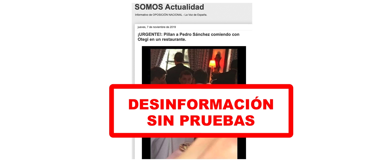 Por su parte, el PSOE ha asegurado a Maldita.es que el contenido en el que se dice que Sánchez es quien sale en la foto comiendo con Otegi "es falso". Además de que el blog SOMOS Actualidad no aporta ningún tipo de prueba que muestre que Sánchez está comiendo con Otegi, no hemos encontrado ninguna referencia en ningún medio de comunicación a dicho encuentro y nadie más ha hablado de esa foto y de la supuesta reunión, de la que no hay ninguna prueba que se haya celebrado.