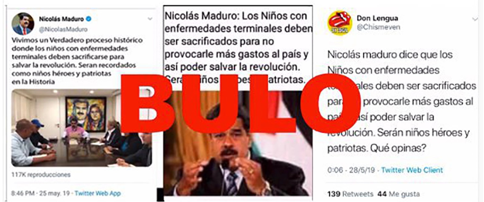 Esta supuesta declaración únicamente aparece en un tuit falso del mandatario que se ha difundido por redes sociales haciéndolo pasar como real. Este tuit falso, que se difunde siempre con la misma captura con el mismo número de retuits y favoritos, hace creer que Nicolás Maduro ha dicho "vivimos un verdadero proceso histórico donde los niños con enfermedades terminales deben sacrificarse para salvar la revolución" y que "serán recordados como niños héroes y patriotas en la historia.