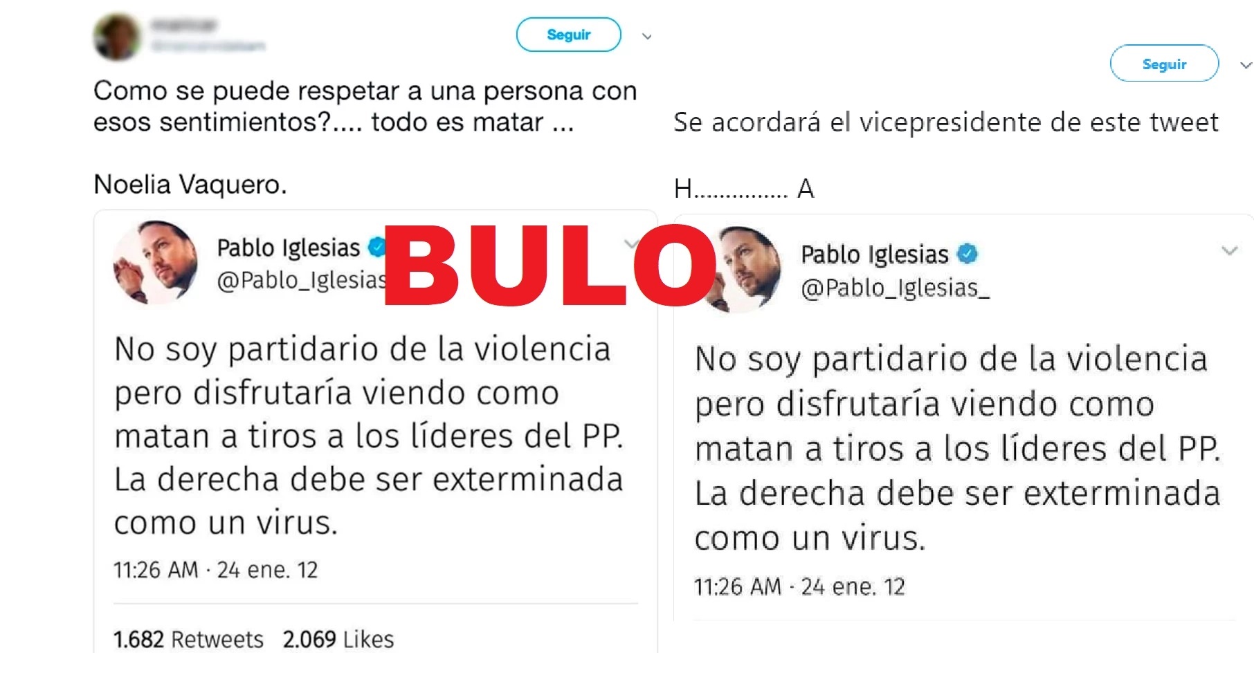 Se está moviendo una captura de un supuesto tuit que habría publicado Pablo Iglesias con el texto: “No soy partidario de la violencia pero disfrutaría viendo cómo matan a tiros a los líderes del PP. La derecha debe ser exterminada como un virus”. Es un bulo.