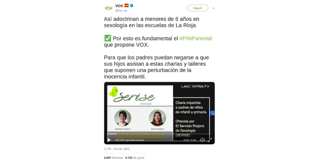 El vídeo compartido por Vox está sacado del canal de La Contra TV, quien lo publicó el 22 de octubre de 2019 con ese mismo título: 'Así adoctrinan a niños menores de 6 años en sexología en las escuelas de La Rioja' aunque el propio vídeo dice que se trata de una "charla impartida a padres de niños de infantil y primaria".
