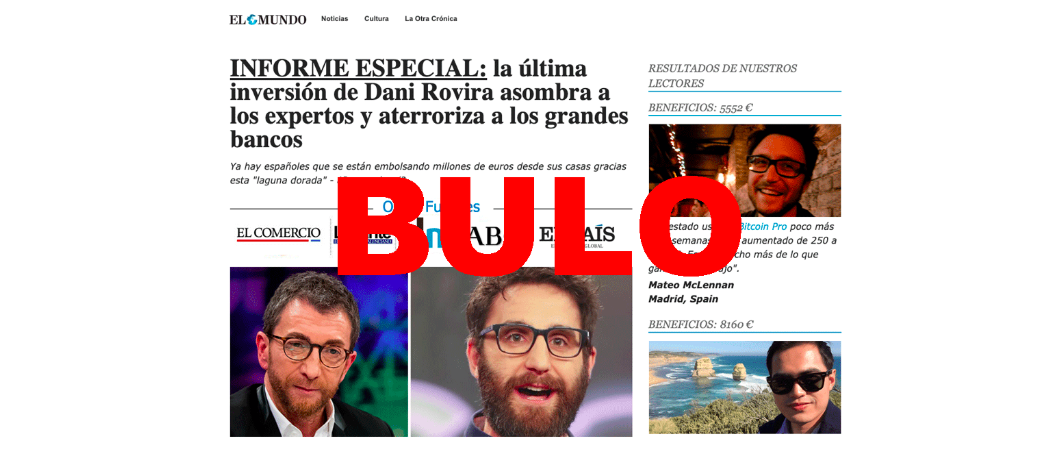 Sigue circulando el timo de las falsas inversiones en bitcoin que usa a caras conocidas para intentar colártela. Ahora le ha tocado al cómico y actor Dani Rovira, quien según este contenido falso que se hace pasar por un artículo de El Mundo habría recomendado invertir en Bitcoin Pro en El Hormiguero. No es cierto.