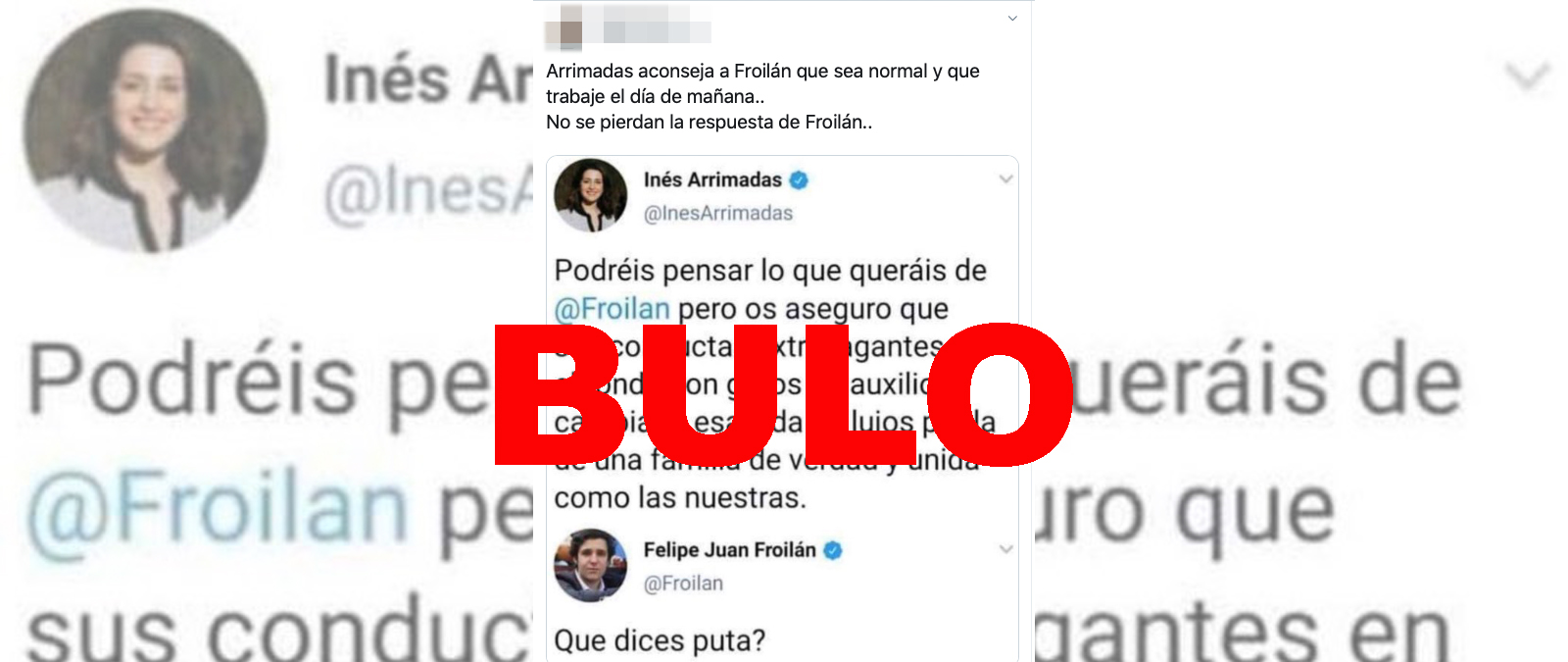 Se está volviendo a difundir una captura de un supuesto tuit en el que Inés Arrimadas dice "podréis pensar lo que queráis de @froilan pero os aseguro que sus conductas extravagantes en el fondo son gritos de auxilio y cambiaría esa vida de lujos por la de una familia de verdad y unida como las nuestras". En esta captura también aparece una supuesta respuesta de Felipe Juan Froilán, sobrino del rey, en el que dice "que dices puta?".