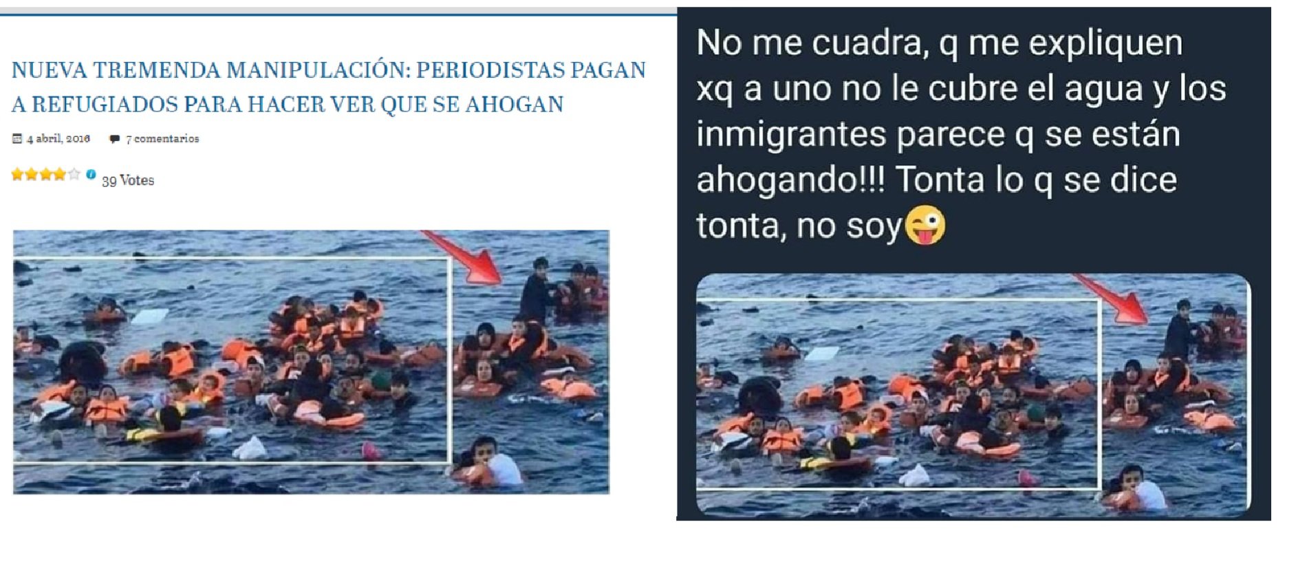 Otras webs como Somatemps o LodehoyRd.com aseguran en su cabecera que detrás de las imágenes "hay periodistas que pagan a refugiados para hacer ver que se ahogan" y añaden que "en la foto que presentamos se puede ver claramente una multitud que disimula [sic] estar en peligro por no tocar fondo con los pies".