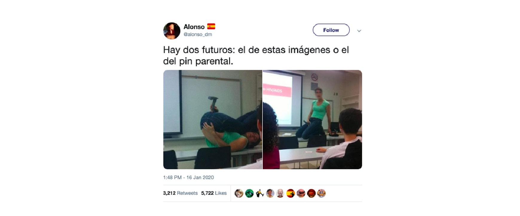 Coincidiendo con el debate sobre el llamado "pin parental", se han empezado a viralizar unas imágenes de una mujer realizando varias posturas sexuales en una clase, que se mueven con el siguiente texto: "Hay dos futuros: el de estas imágenes o el del pin parental". Las fotos que se relacionan con ese "pin parental" no son ni de una escuela ni fueron tomadas en España: corresponden a un curso impartido en una universidad de Canadá.