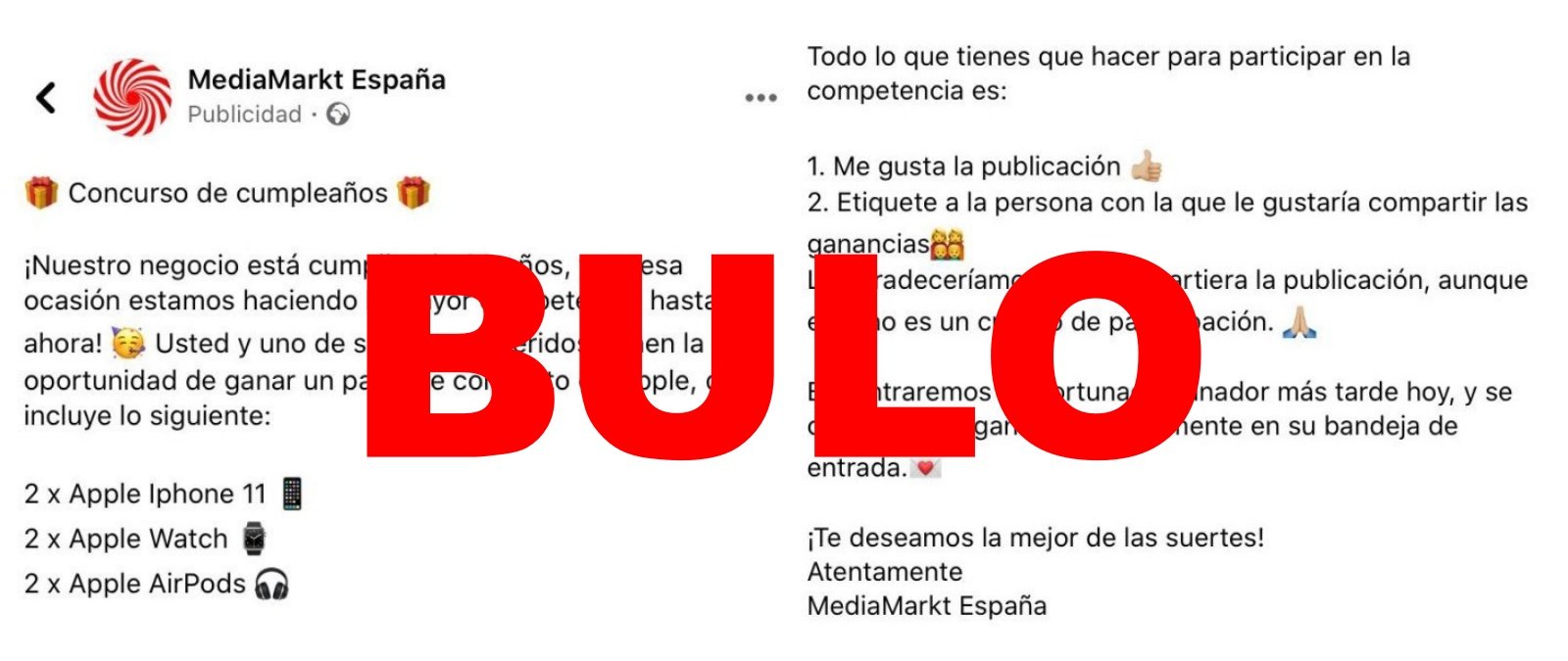 Nos habéis consultado por un supuesto sorteo de MediaMarkt en Facebook para regalar paquetes de productos de Apple por el 30º aniversario de la compañía. Es un bulo, la propia empresa lo ha desmentido y ha afirmado que se trata de un intento de phishing, una técnica que se utiliza para intentar hacerse con tus datos personales.