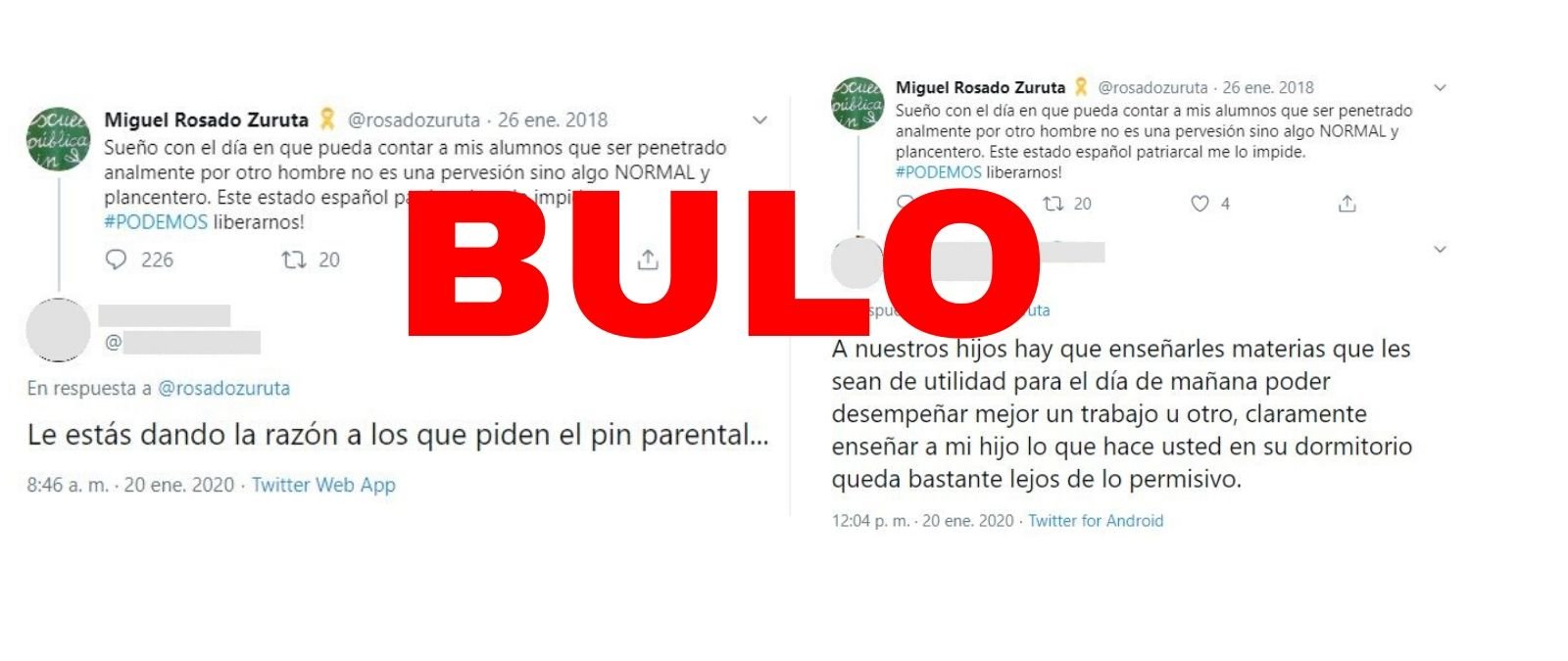Aunque la cuenta no tuitea desde principios de 2018, varios de sus tuits han tenido cientos de interacciones en los últimos días como consecuencia de las desinformaciones y manipulaciones que circulan sobre el llamado "pin parental". Además, la antigua foto de perfil pertenece a un argentino llamado "Juan Manuel Vázquez Blanco" que no tiene nada que ver con esa cuenta ni con Podemos. Por tanto, el perfil de Twitter de @rosadozuruta se trata de una cuenta troll que se hace pasar por un miembro de Podemos, pero que no tiene ningún vínculo con la formación.
