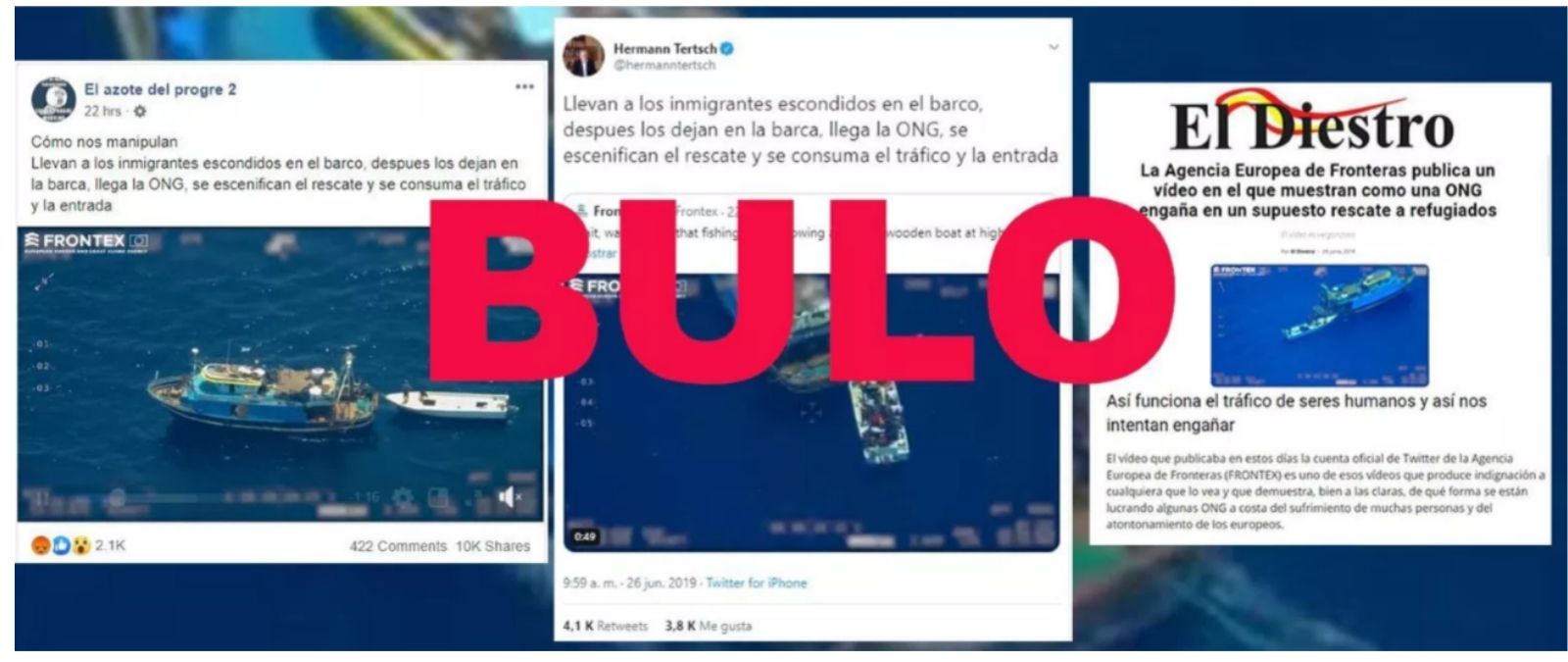 Nos estáis preguntado por un vídeo de la Agencia Europea de la Guardia de Fronteras y Costas (conocida como FRONTEX por sus siglas en inglés) en el que se aprecia a una multitud de personas, algunas con chalecos salvavidas, saltando de un barco pesquero a un bote más pequeño en medio del mar y a plena luz del día. Como os contamos se difundió diciendo que son ONG (Organizaciones No Gubernamentales) que "escenifican un rescate". Es un bulo: no hay ninguna ONG implicada en la operación.