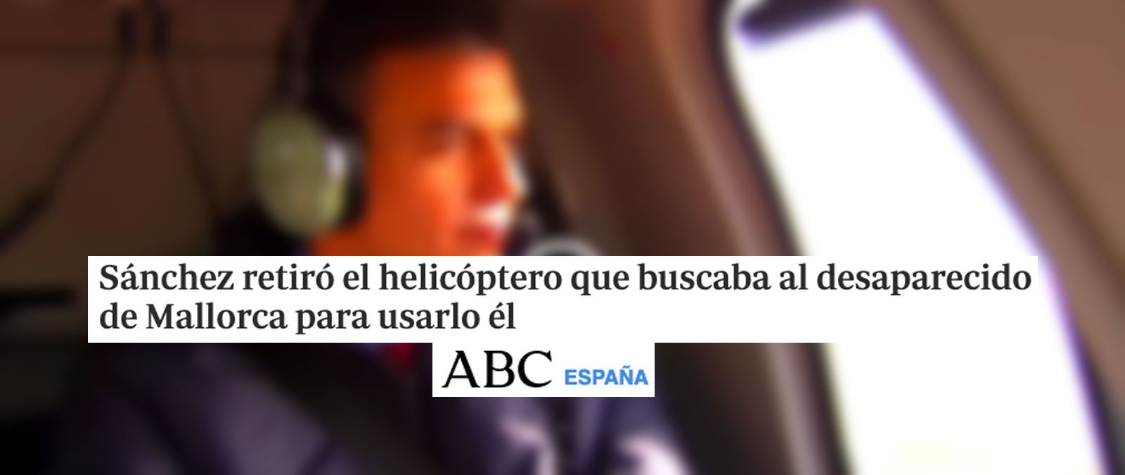 Nos habéis preguntado mucho por un contenido que publicó el diario ABC en el que se asegura que el presidente del Gobierno, Pedro Sánchez, "retiró el helicóptero que buscaba al desaparecido de Mallorca para usarlo él" durante la visita que hizo el pasado jueves 23 a la isla para comprobar los efectos de la borrasca Gloria. Otros medios como Libertad Digital y El Mundo se hicieron eco del contenido.