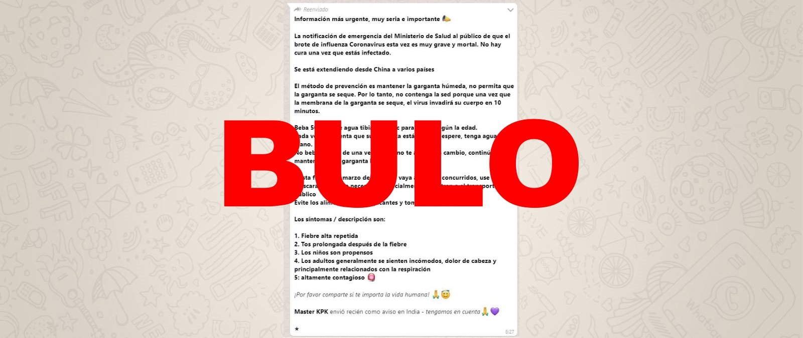 Además, aseguran que "ninguna de las investigaciones o avisos de ningún país" mencionan "la garganta seca" o recomiendan "beber solo una cierta cantidad de agua". También afirman que, por el momento, el coronavirus no se ha asociado a "la comida picante o a la deficiencia de vitamina C", así como que ha habido muy pocos niños afectados por el virus, a pesar de que el mensaje diga que los niños son muy vulnerables a la enfermedad.