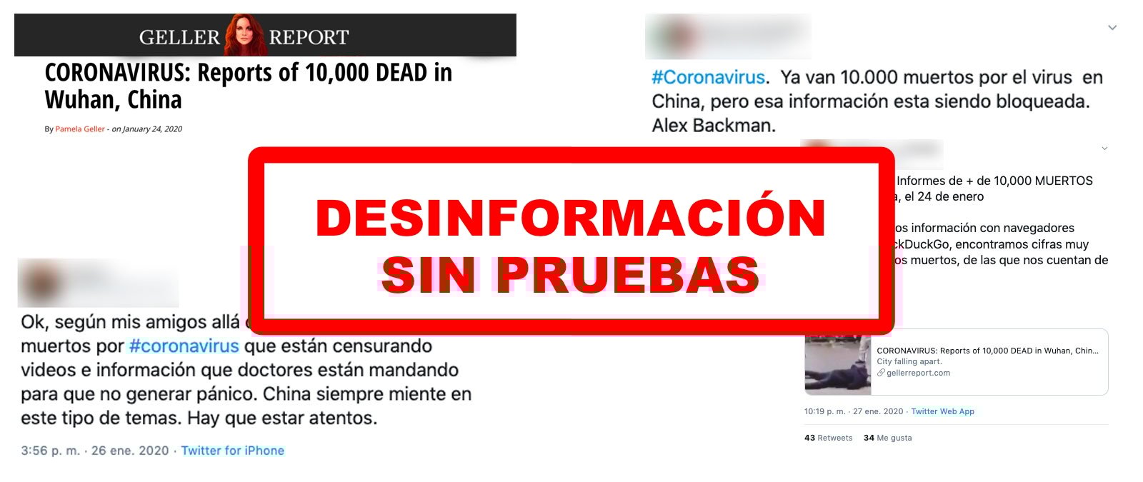 Una de las webs que difunde la teoría sin pruebas de los 10.000 muertos es Geller Report, que basa su contenido en una publicación del blog JSMineset. En dicha publicación, se dice que han obtenido la cifra a través de "un amigo americano cercano que acaba de hablar por teléfono con un amigo chino". No se basa en ningún documento oficial, únicamente en el testimonio del amigo de un amigo, que es una fórmula muy frecuente en la desinformación.