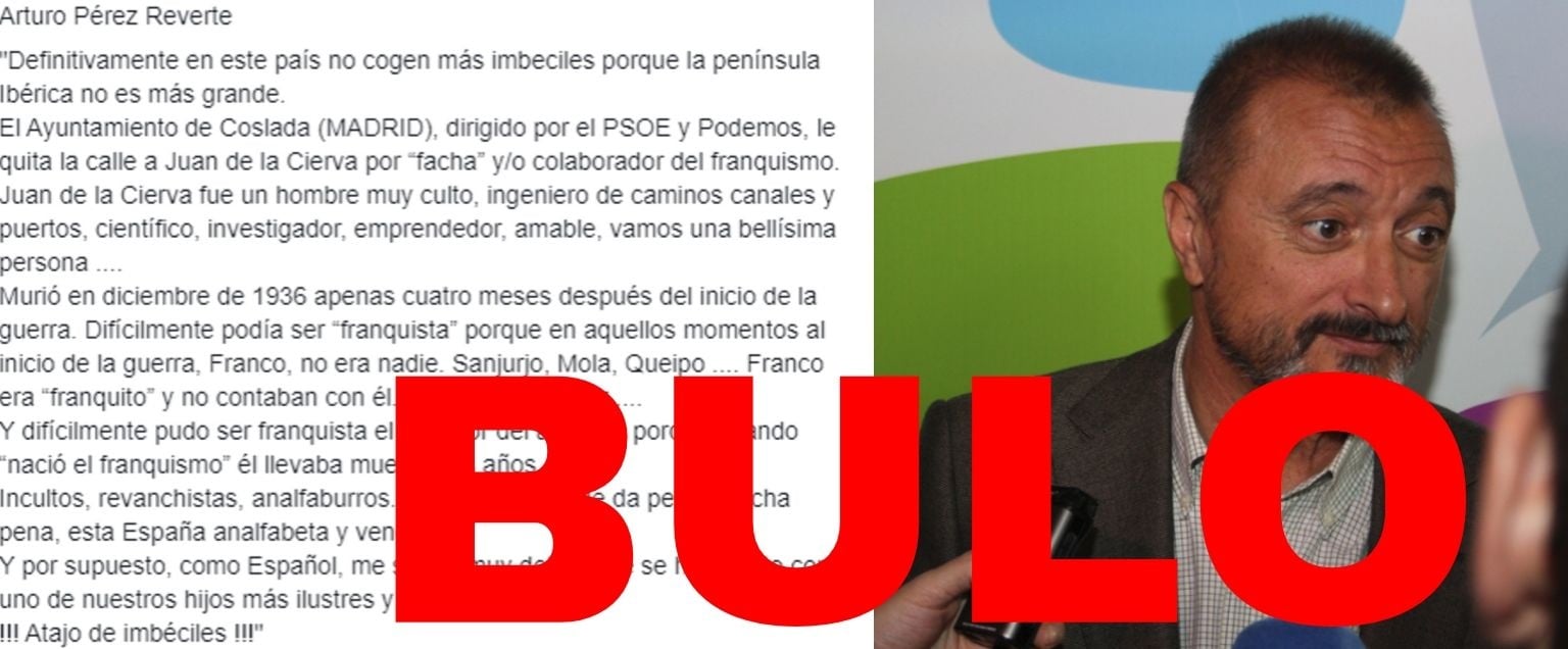 El propio Pérez-Reverte nos lo ha desmentido a través de Twitter. Además, no hay ningún tuit o artículo suyo publicado en medios de comunicación sobre la retirada de calle a Juan de la Cierva.