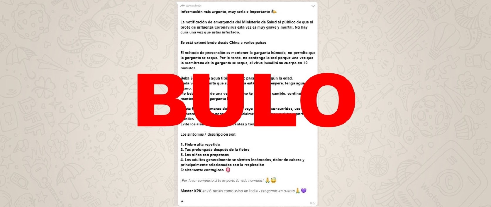 Además, aseguran que "ninguna de las investigaciones o avisos de ningún país" mencionan "la garganta seca" o recomiendan "beber solo una cierta cantidad de agua". También afirman que, por el momento, el coronavirus no se ha asociado a "la comida picante o a la deficiencia de vitamina C", así como que ha habido muy pocos niños afectados por el virus, a pesar de que el mensaje diga que los niños son muy vulnerables a la enfermedad.