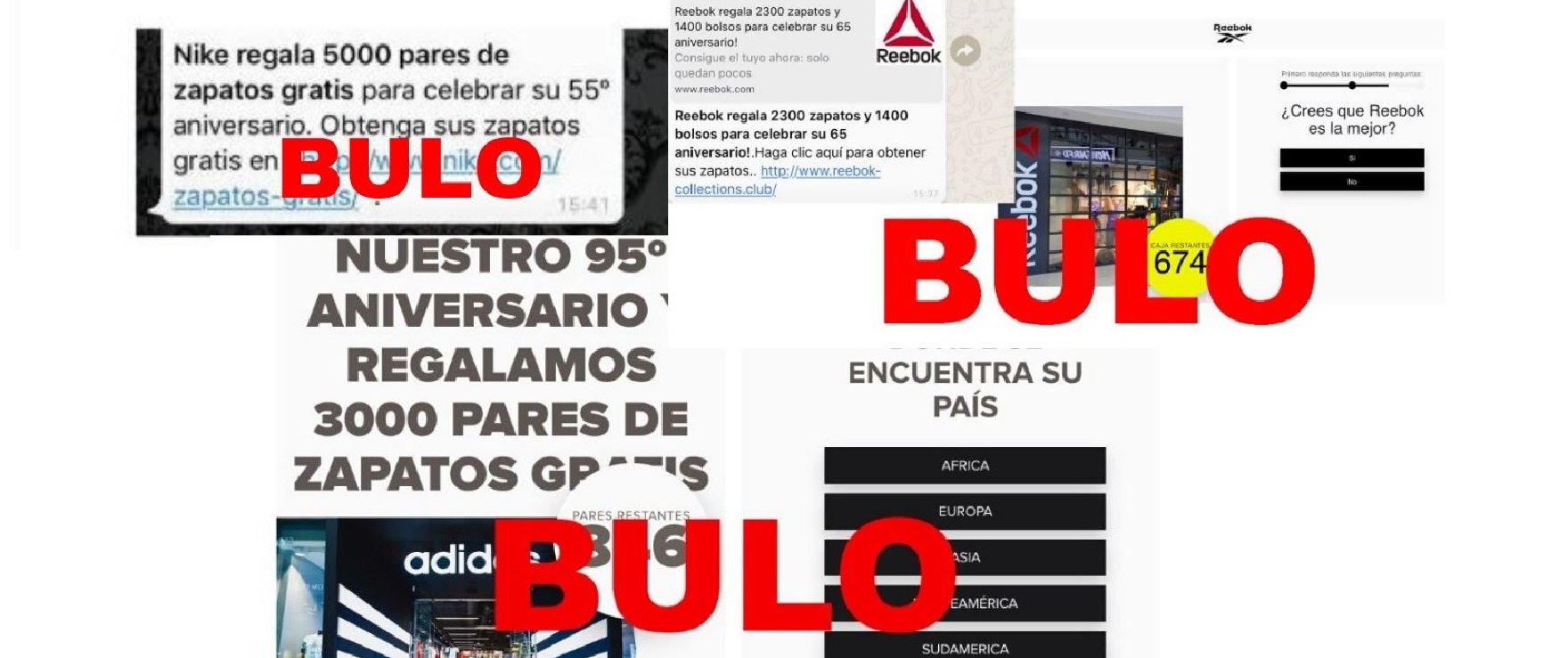 Si ves un supuesto mensaje de Rebook que dice que Reebok "regala 2.300 zapatos y 1.400 bolsos para celebrar su 65º aniversario" desconfía, porque es un bulo. Ni es el 65º aniversario de la empresa ni la web de la falsa promoción es la oficial. El mensaje puede confundirse con una promoción real al incluir la imagen corporativa de la empresa y una dirección puede parecer oficial, pero no lo es. En la web engañosa aparece una encuesta que necesitas realizar para conseguir el premio. lo que buscan es que des tus datos y compartas la página para conseguir también los datos de tus contactos.