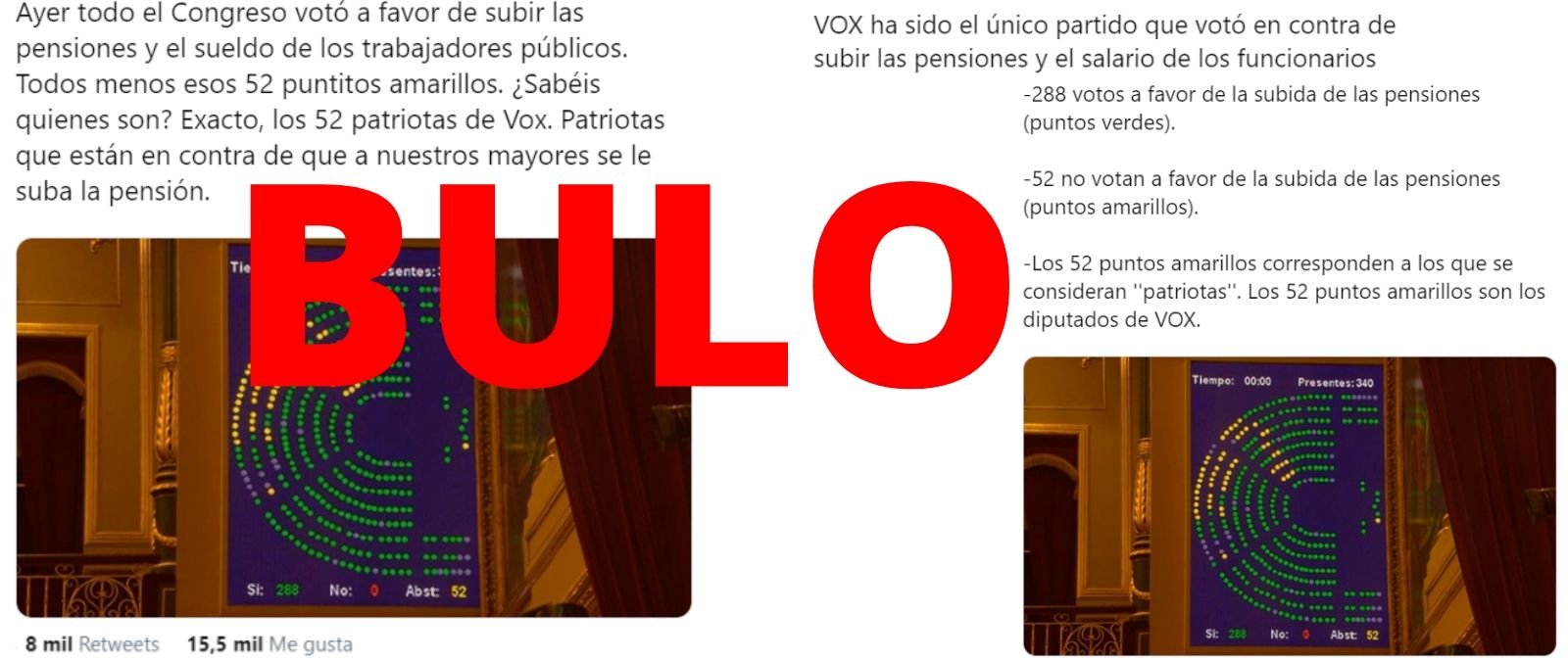 Se han viralizado contenidos en redes sociales que afirman que sólo Vox votó en contra o se abstuvo (según la versión) de subir las pensiones y el sueldo de los trabajadores públicos. Es un bulo: Vox, la CUP (Candidatura d'Unitat Popular) y BNG (Bloque Nacionalista Galego) se abstuvieron ante estos dos decretos.
