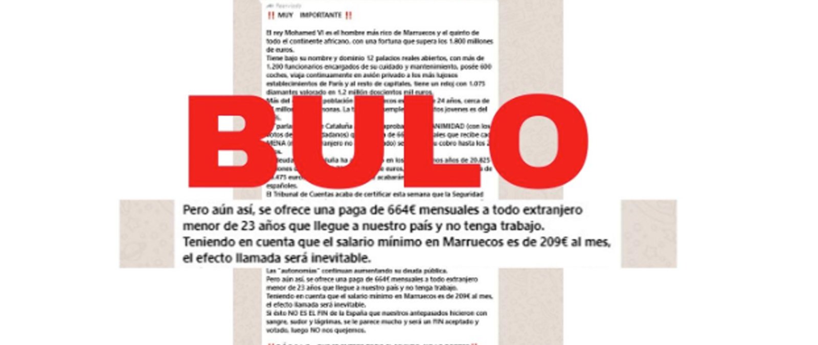 Vuelve a circular una cadena de WhastApp que empieza hablando del rey Mohamed VI como "el hombre más rico de Marruecos y el quinto de todo el continente africano...". Después, pasa por la deuda de Cataluña y cierra con el salario mínimo en Marruecos. A medio camino asegura que "se ofrece una paga de 664€ mensuales a todo extranjero menor de 23 años que llegue a nuestro país y no tenga trabajo".