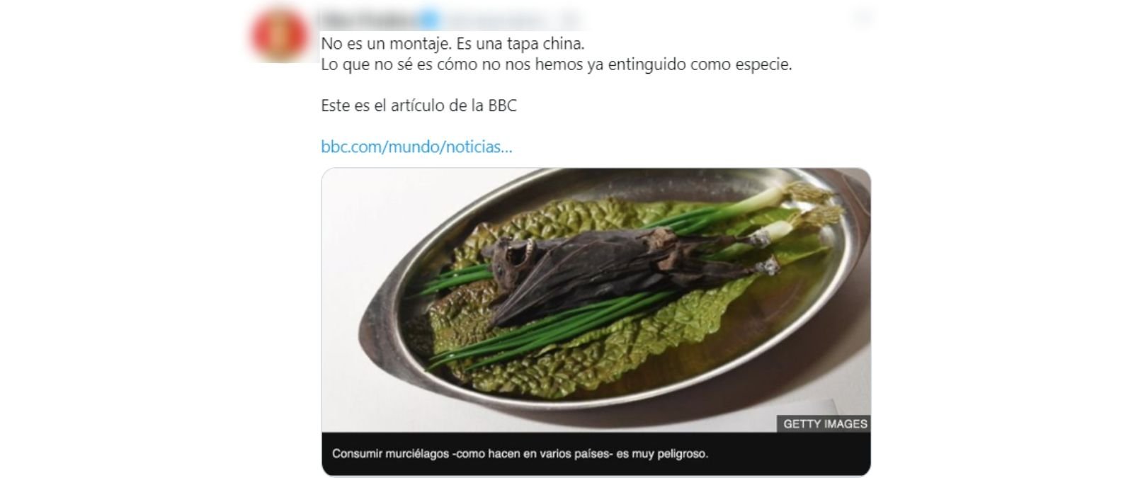 Se trata de un mensaje publicado en Twitter basándose en un artículo de la BBC titulado "Coronavirus: por qué los murciélagos, considerados la probable fuente de la neumonía de Wuhan, transmiten tantos virus". Aquí utilizan diferentes imágenes de recursos para hablar de este mamífero y el brote del nuevo coronavirus. En una de ellas aparece la del murciélago emplatado. Sin embargo, en ningún caso, el texto de la BBC indica en el pie de foto que este plato corresponda a una "tapa china" como asegura el tuit sino que advierte que "consumir murciélagos -como hacen en varios países- es muy peligroso".
