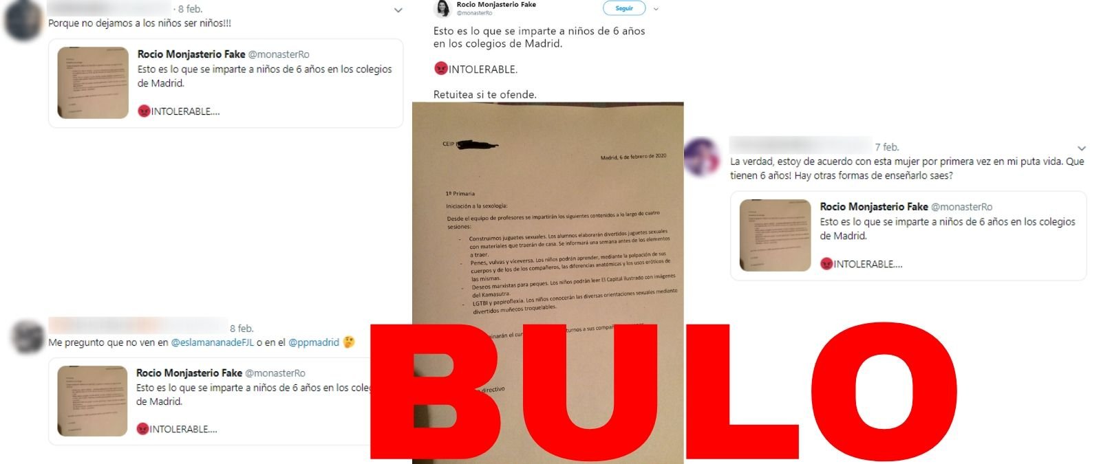 Se ha viralizado como real una imagen firmada por "el equipo directivo" de un colegio de Madrid en el que se dice que los profesores darán un curso de iniciación a la sexología a alumnos de Primero de Primaria donde construirán juguetes sexuales, los niños palparán "sus cuerpos y de los de los compañeros", les darán "deseos marxistas para peques" y "las niñas terminarán el cursillo violando por turnos a sus compañeros varones". Es un bulo: ha sido difundido originalmente por una cuenta falsa de Rocío Monasterio en Twitter. Tras realizar una búsqueda inversa de la imagen no se ha realizado ninguna publicación previa a la de la cuenta falsa de Monasterio.