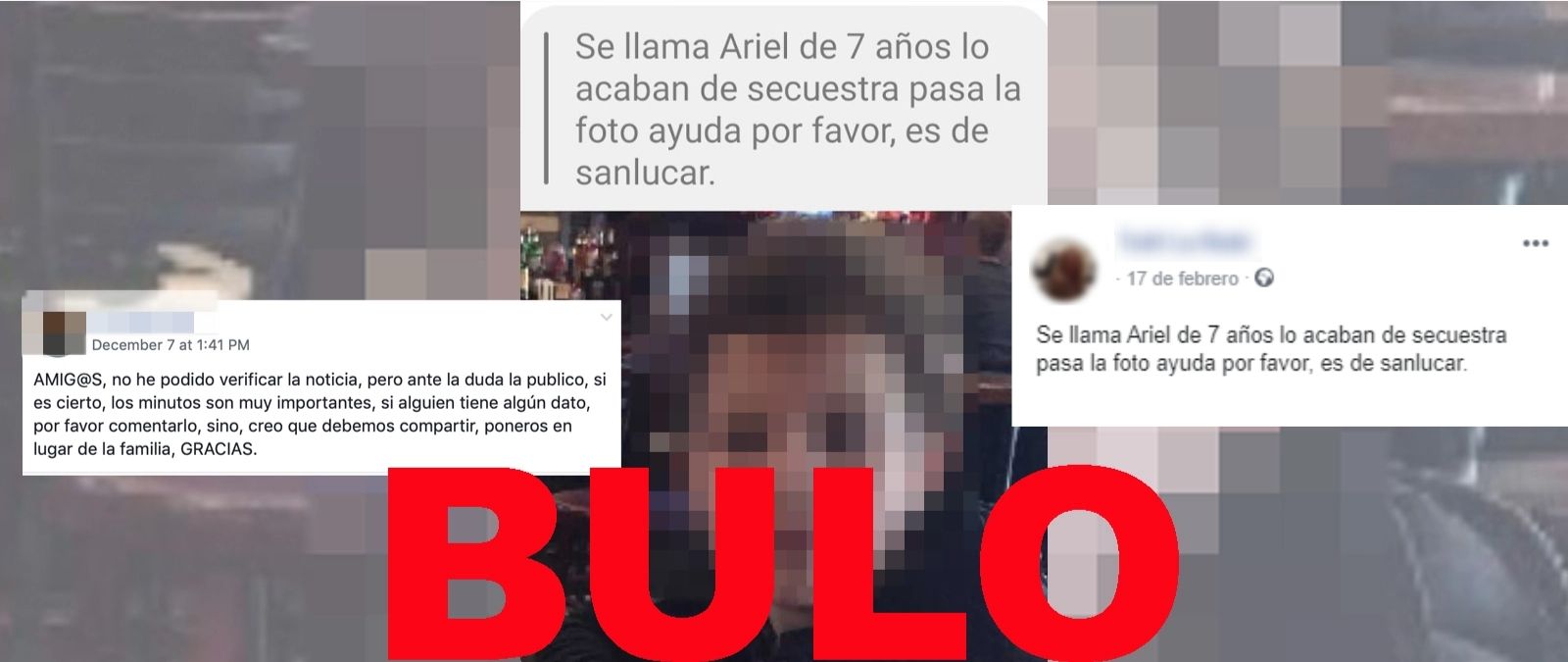Circula una fotografía de un niño junto a un mensaje que afirma que se llama Ariel y que acaba de desaparecer en Sanlúcar de Barrameda (Cádiz). Es un bulo que ya desmentimos y que ahora vuelve. La Policía Local y la Guardia Civil lo desmienten y se basa en la desaparición real de un niño en marzo de 2016 en Connecticut (Estados Unidos), pero que apareció pocas horas después.