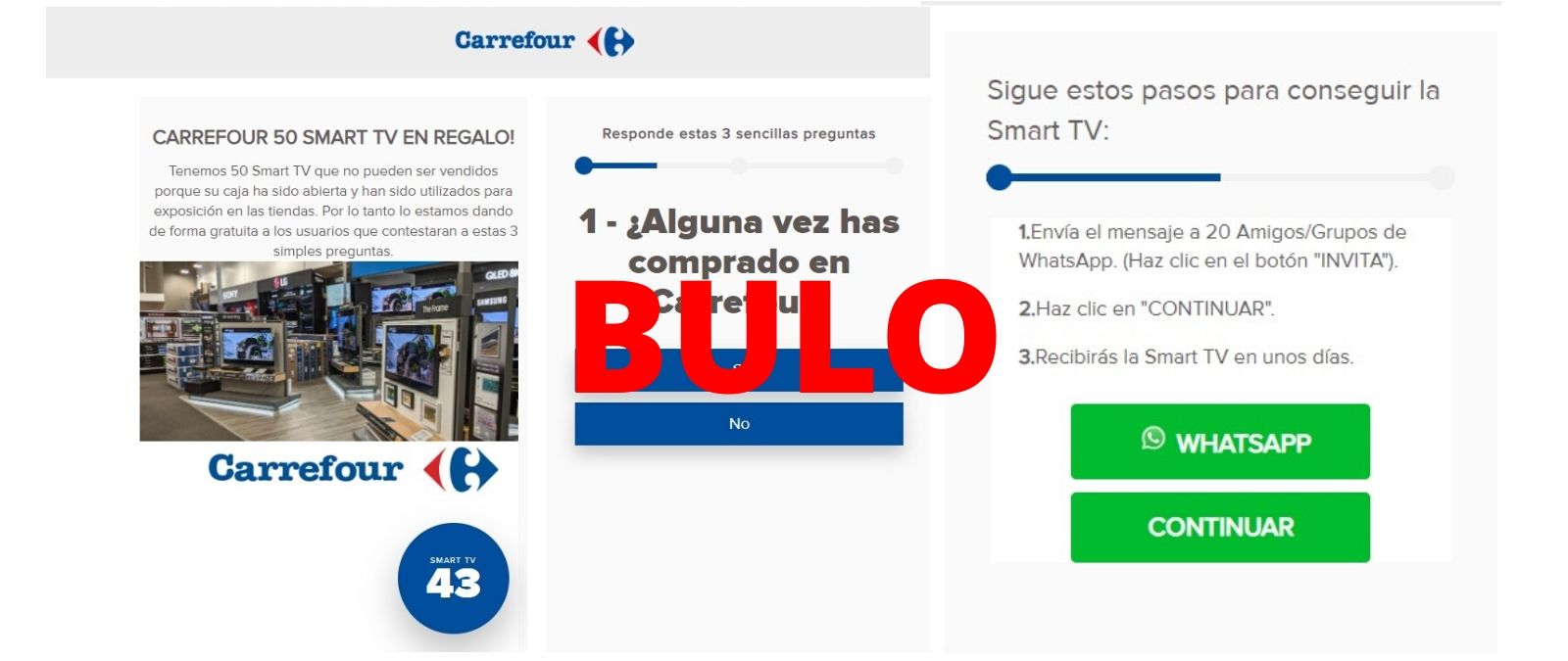 Nos hemos puesto en contacto con Carrefour, que nos ha confirmado que "el tema los 50 Smart TV es falso", y la web que se está moviendo no es la oficial de Carrefour. Además, una vez que contestamos a las preguntas, no hay ni rastro de la Smart TV, solo nos pide que compartamos el mensaje por WhatsApp.