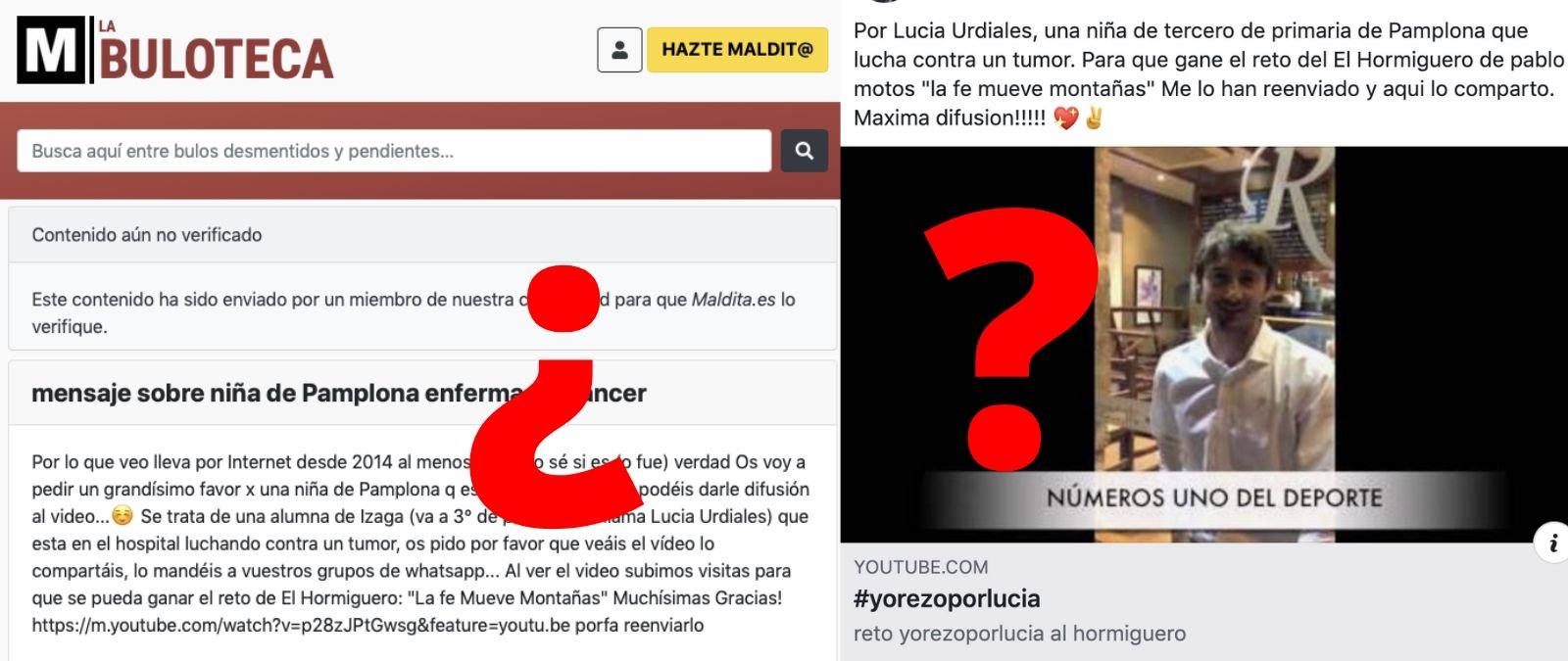 Cadena de WhatsApp sobre un supuesto reto de El Hormiguero llamado "la fe mueve montañas" para ayudar a una niña con un tumor llamada Lucía Urdiales. Os voy a pedir un grand&iacute;simo favor x una ni&ntilde;a de Pamplona q est&aacute; enferma, as&iacute; q si pod&eacute;is darle difusi&oacute;n al video... Se trata de una alumna de Izaga (va a 3&deg; de primaria, se llama Lucia Urdiales) que esta en el hospital luchando contra un tumor, os pido por favor que ve&aacute;is el v&iacute;deo lo compart&aacute;is, lo mand&eacute;is a vuestros grupos de whatsapp...<br /> Al ver el video subimos visitas para que se pueda ganar el reto de El Hormiguero: &quot;La fe Mueve Monta&ntilde;as&quot;<br /> Much&iacute;simas Gracias!<br /> https://m.youtube.com/watch?v=p28zJPtGwsg&amp;feature=youtu.be<br /> porfa reenviarlo</p> <p>&nbsp;</p> <p>&nbsp;</p> <p>yorezoporlucia</p> <p><a href="https://www.youtube.com/watch?v=p28zJPtGwsg&amp;feature=youtu.be&amp;fbclid=IwAR3yVTkLG04P3CAvAxF7waVopjJIkn5T2_z7UAa68xYt8PdbJMlVprzDMKk&amp;app=desktop">https://www.youtube.com/watch?v=p28zJPtGwsg&amp;feature=youtu.be&amp;fbclid=IwAR3yVTkLG04P3CAvAxF7waVopjJIkn5T2_z7UAa68xYt8PdbJMlVprzDMKk&amp;app=desktop</a></p>