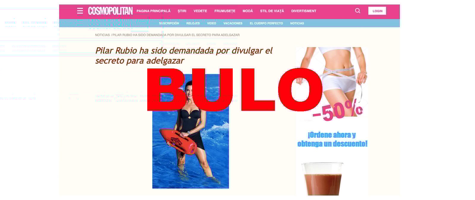 Otro clásico de estos timos son las faltas ortográficas y las frases sin sentido. Eso ocurre también en el contenido que suplanta a Cosmopolitan ya que escriben cosas como: "hace un par de días el proceso judicial ha terminado. Anticipando los hechos, podemos decir que Sara ha ganado el pleito". Como ves, no sólo está mal escrito, sino que le cambian el nombre a Pilar Rubio por "Sara".