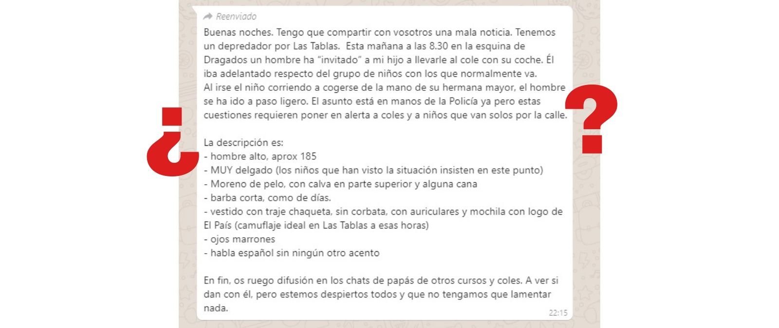 Nos habéis preguntado por una cadena de WhatsApp que está circulando en la que hablan de un posible caso de secuestro a un niño en la zona de Las Tablas (Madrid). El mensaje dice lo siguiente: "tenemos un depredador por Las Tablas. Esta mañana a las 8.30 en la esquina de Dragados un hombre ha “invitado” a mi hijo a llevarle al cole con su coche. Él iba adelantado respecto del grupo de niños con los que normalmente va".