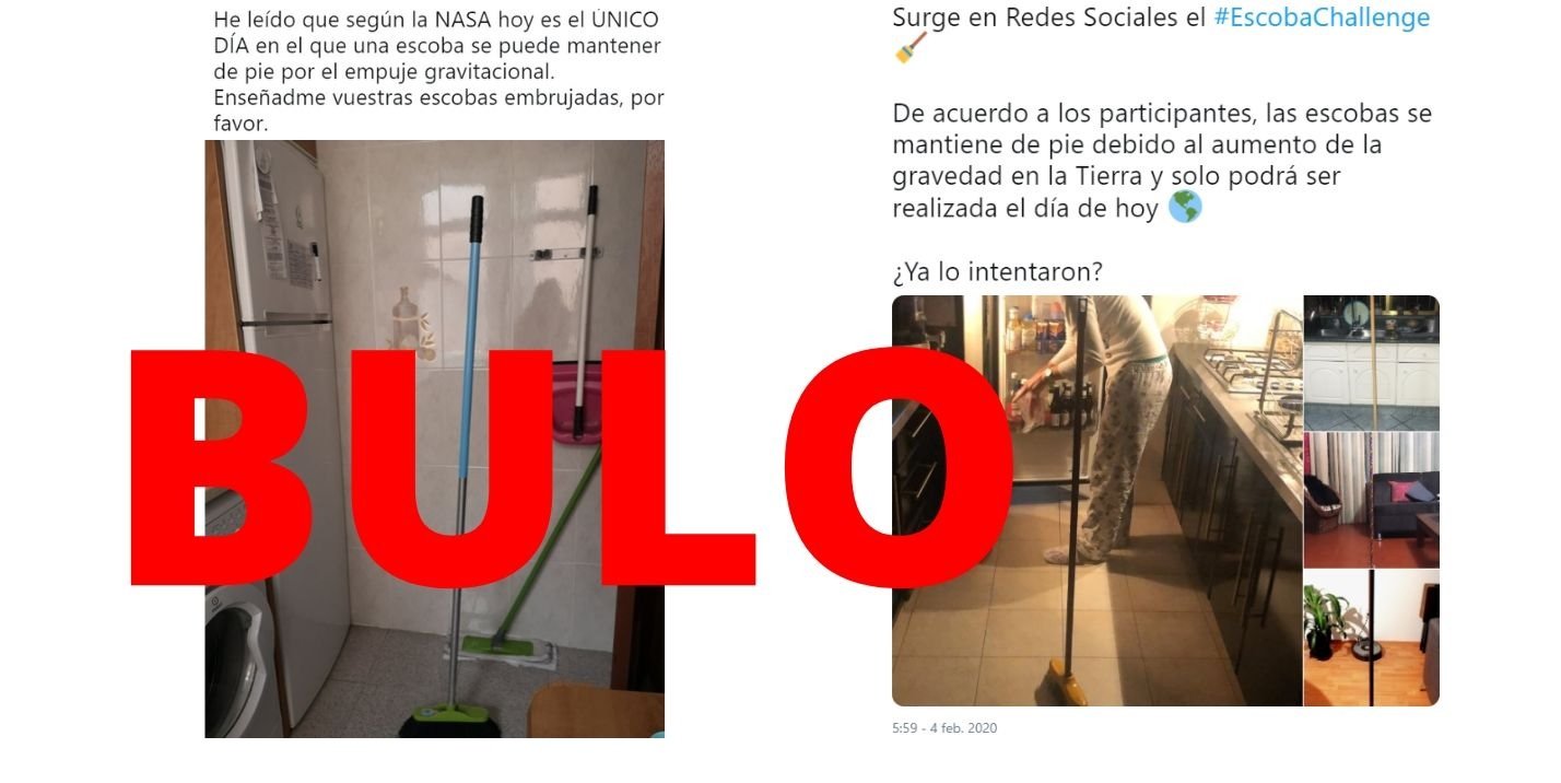 Circula desde hace días un reto viral llamado #EscobaChallenge consistente en dejar de pie una escoba sin que se apoye en nada y que no se caiga. Según varios contenidos virales, la NASA dijo que sólo se puede hacer "hoy" por un "aumento de la gravedad". Es un bulo que la NASA haya dicho que sólo se pueda hacer un día por un aumento de la gravedad: se puede hacer cualquier día.