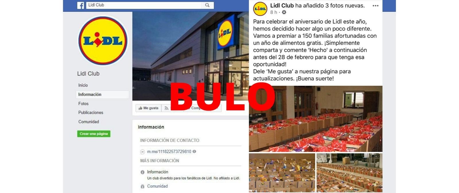 El post que se ha estado moviendo en Facebook pide que los usuarios compartan y comenten la publicación antes del 28 de febrero para conseguir supuestamente un año de alimentos gratis. Pero la página desde la que se publica, "Lidl Club", no es de la cuenta oficial de Facebook de Lidl, aunque utilice su logo. Se trata de una página de comunidad en cuya información especifica que es "un club divertido para los fanáticos de Lidl. No afiliado a Lidl".