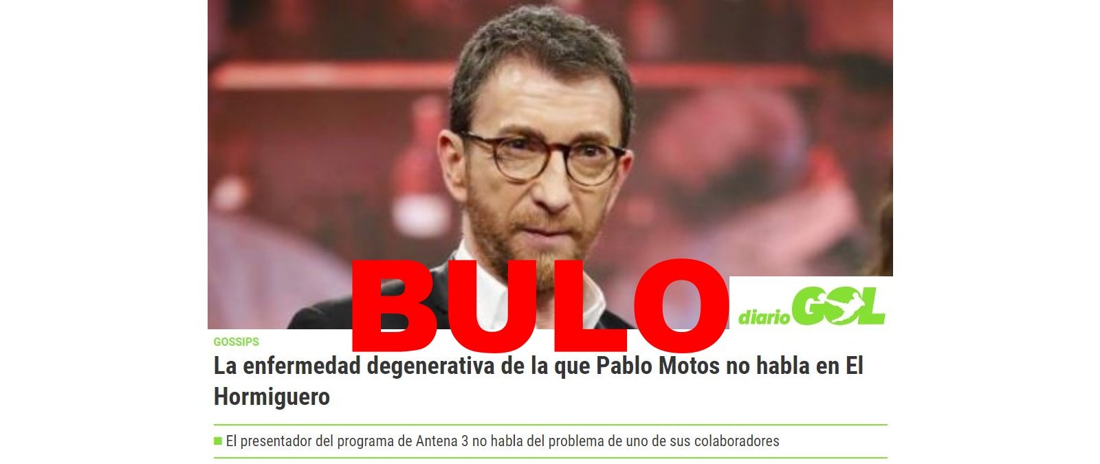 Un titular desinformador de la web Diario Gol da a entender que Pablo Motos tiene una enfermedad degenerativa: "La enfermedad degenerativa de la que Pablo Motos no habla en El Hormiguero". Además, el contenido va acompañado de una fotografía del presentador.