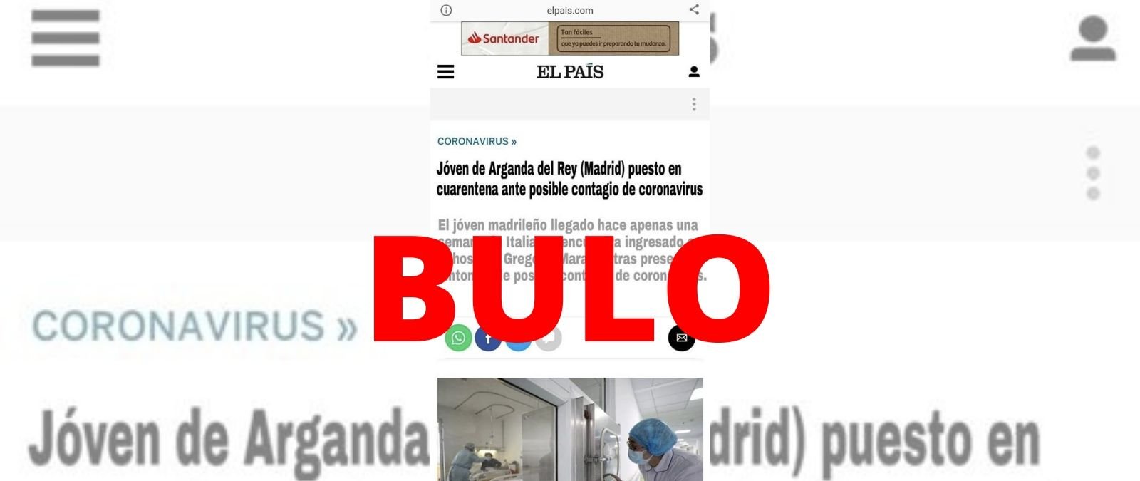 En esta imagen que se difunde aparece la cabecera del medio El País junto con el titular "Joven de Arganda del Rey (Madrid) puesto en cuarentena ante posible contagio de coronavirus" y el subtítulo "el joven madrileño llegado hace apenas una semana de Italia, se encuentra ingresado en el hospital Gregorio Marañón tras presentar síntomas de posible contagio de coronavirus".