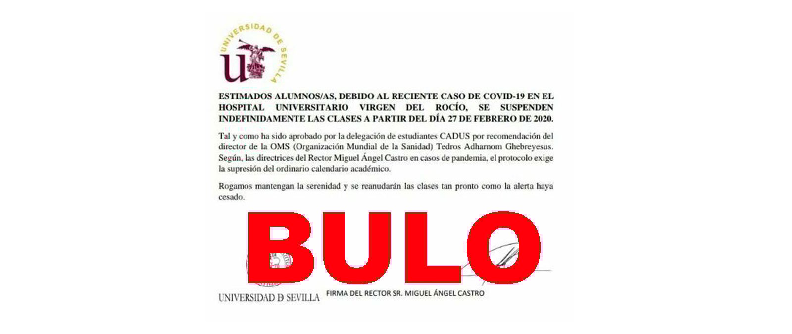 Por lo tanto, no es cierto que la Universidad de Sevilla haya suspendido las clases a partir del 27 de febrero por el coronavirus. Es un bulo similar a este otro en el que se decía que se habían suspendido las clases y actividades escolares en Cataluña.