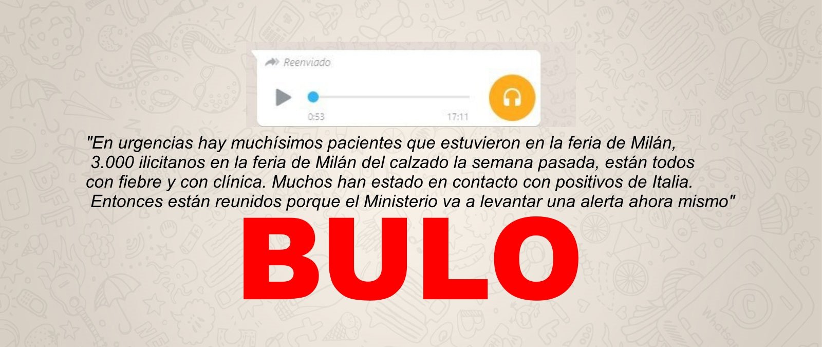 Hemos contactado con el Ayuntamiento de Elche y nos dicen que el audio que circula "es un bulo total" y que en la localidad no hay ningún caso confirmado de coronavirus. Además, el audio dice que el Ministerio de Sanidad va a emitir "una alerta ahora mismo". Pero la primera vez que lo recibimos fue el pasado 26 de febrero y, a día de hoy, el ministerio no ha lanzado ningún comunicado a este respecto.