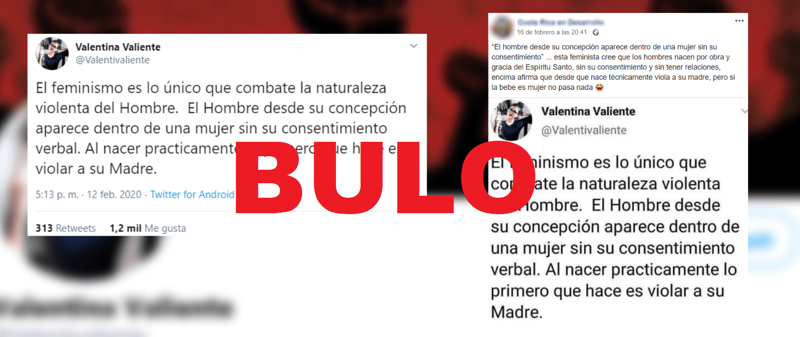 Nos habéis preguntado por un tuit publicado por una cuenta de Twitter supuestamente feminista, @Valentivaliente, que dice que "el feminismo es lo único que combate la naturaleza violenta del hombre. El hombre desde su concepción aparece dentro de una mujer sin su consentimiento verbal. Al nacer prácticamente lo primero que hace es violar a su madre". Es un bulo: se trata de un tuit de una cuenta que se autodenomina como "fake".