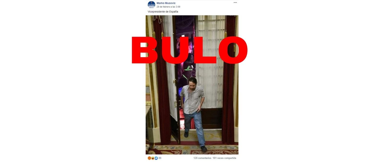 Se está compartiendo por foros y redes sociales como Facebook una imagen del vicepresidente del Gobierno Pablo Iglesias en la que supuestamente se le ve salir de lo que parece un club nocturno con la camisa manchada. Es un montaje. La fotografía original está tomada en el Congreso de los Diputados y en ella la camisa de Iglesias no tiene manchas.