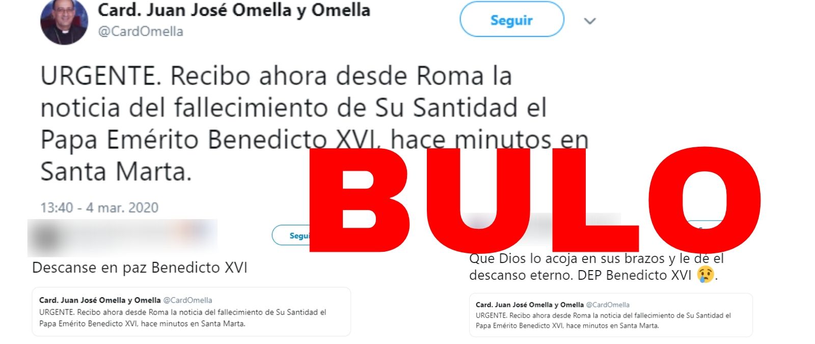 Se ha viralizado un tuit de una cuenta falsa que se hace pasar por el cardenal y presidente de la Conferencia Episcopal Juan José Omella: 'URGENTE. Recibo ahora desde Roma la noticia del fallecimiento de Su Santidad el Papa Emérito Benedicto XVI, hace minutos en Santa Marta'. Es un bulo. Es un tuit de una cuenta falsa creada por el italiano Tommasso Debenedetti.