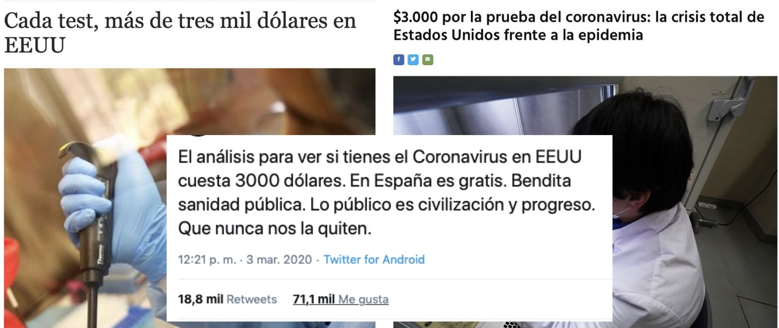 La desinformación sobre el nuevo coronavirus está inundando las redes, algunas de ellas os las contamos en este recopilatorio. En los últimos días nos habéis preguntado si es cierto que el sistema sanitario estadounidense está cobrando 3000$ a los ciudadanos que se hagan la prueba del coronavirus que causa el COVID-19 en Estados Unidos, como dicen mensajes que se difunden por redes sociales. Os contamos lo que sabemos.