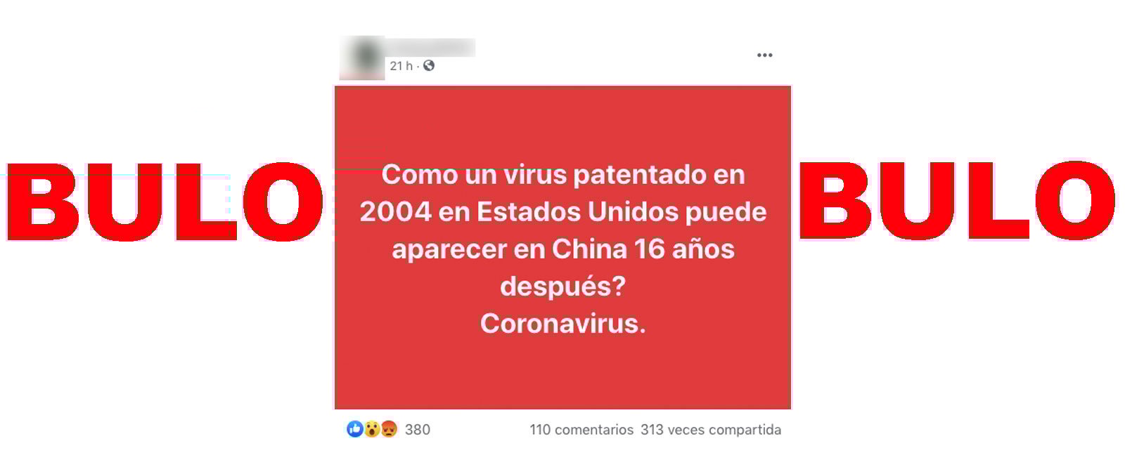 Sobre el coronavirus, un bulo que se mueve mucho es que no es nuevo. En este caso nos habéis consultado por una publicación de Facebook que se pregunta cómo es posible que un virus patentado en Estados Unidos en 2004 pueda "aparecer en China 16 años después". Como ya os hemos contado en Maldita.es, el COVID-19 es sólo uno de los tipos de enfermedad por coronavirus que existen y sí que ha sido descubierto recientemente (a finales de 2019, concretamente). De los otros tipos de coronavirus ya se tenía conocimiento desde hace años, de allí que existan patentes o incluso productos que ayudan a prevenir la infección de los mismos.