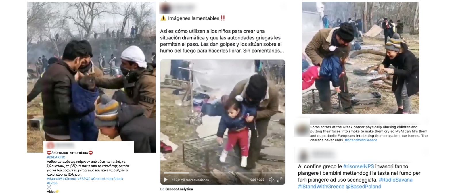 Coincidiendo con la crisis migratoria en la frontera entre Grecia y Turquía ha empezado a circular un vídeo en el que unos adultos sostienen a una niña sobre una hoguera y le dan golpes en la espalda. Según varios tuits virales en castellano, inglés, italiano y griego, la golpean para hacerla llorar frente a las cámaras.