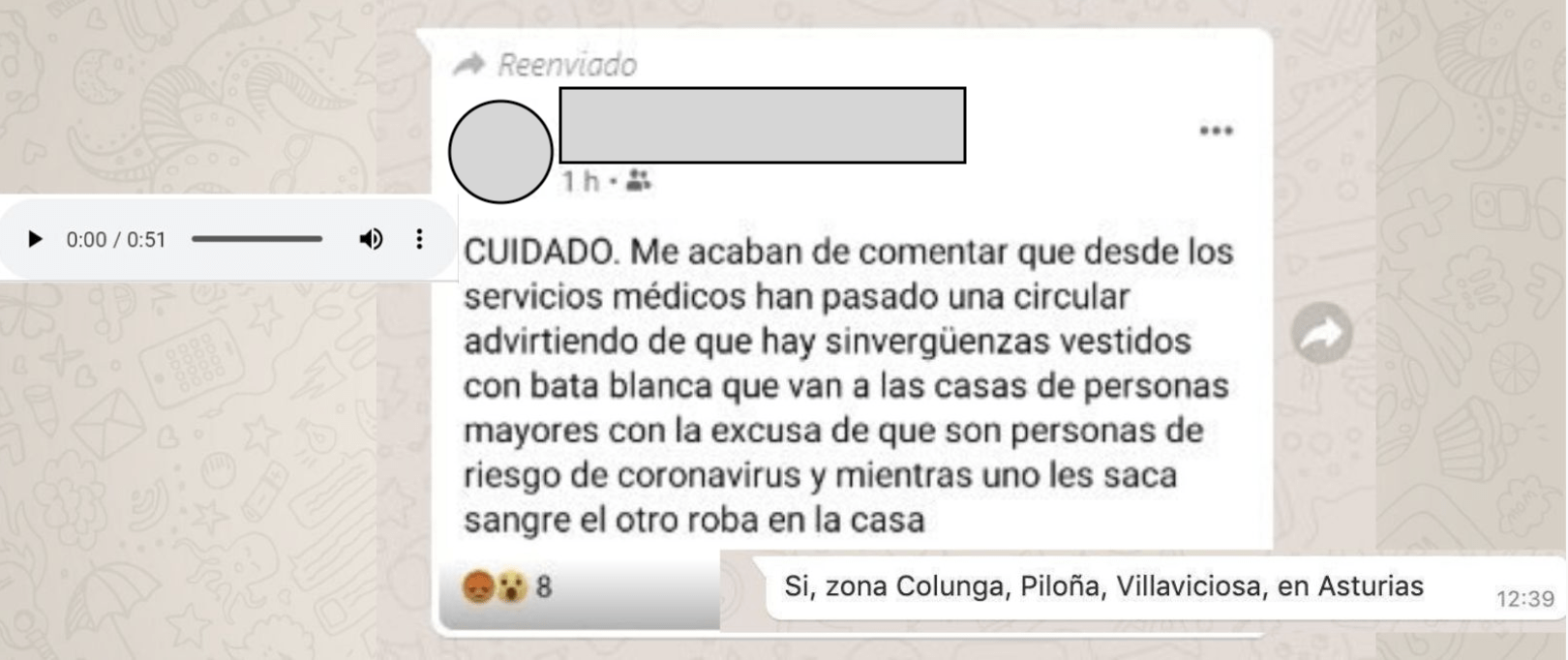 El audio que se está compartiendo habla de una “circular interna de COFAS y de la Cruz Roja”. Esa supuesta circular alerta de que “al parecer están desvalijando a las personas mayores, porque los controlan, pican a la puerta con una bata blanca de Cabueñes (el Hospital Universitario de Gijón)” y les dicen que son personas de riesgo por el coronavirus, y mientras uno les saca la sangre, el otro los desvalija.