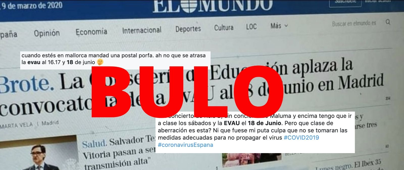 Después de que la Comunidad de Madrid anunciara este 9 de marzo el cierre de colegios por el coronavirus, se han sucedido los bulos sobre falsos anuncios de esta institución. Ahora nos preguntáis por una captura que está circulando por redes sociales de un supuesto artículo de El Mundo titulado "La Consejería de Educación aplaza la convocatoria de la EvAU al 18 de junio en Madrid". Es un bulo: El Mundo no ha publicado este artículo, se trata de un montaje y desde Consejería de Educación afirman que "no se ha anunciado nada al respecto".