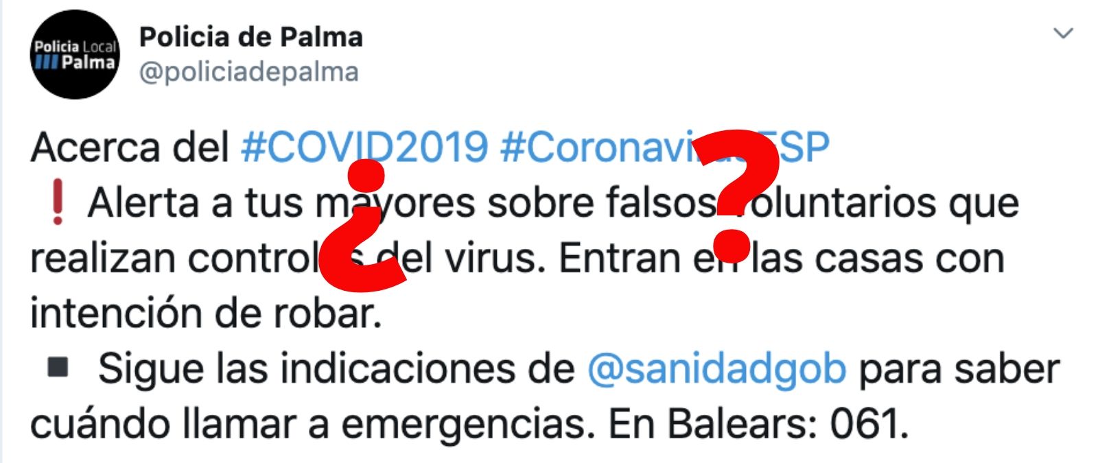 En el tuit publicado por la Policía Local de Palma se pide a la población que alerte a los mayores "sobre falsos voluntarios que realizan controles del virus. Entran en las casas con intención de robar". Sin embargo, desde Seguridad Ciudadana del Ayuntamiento de Palma, que gestiona la Policía Local de Palma, aseguran a Maldita.es que no se tiene "constancia de este tipo de casos ni en Palma, ni en Mallorca ni en Baleares". Desde esta institución aseguran que esta alerta publicada en redes sociales estaba haciéndose eco de una alerta de Cruz Roja Álava.