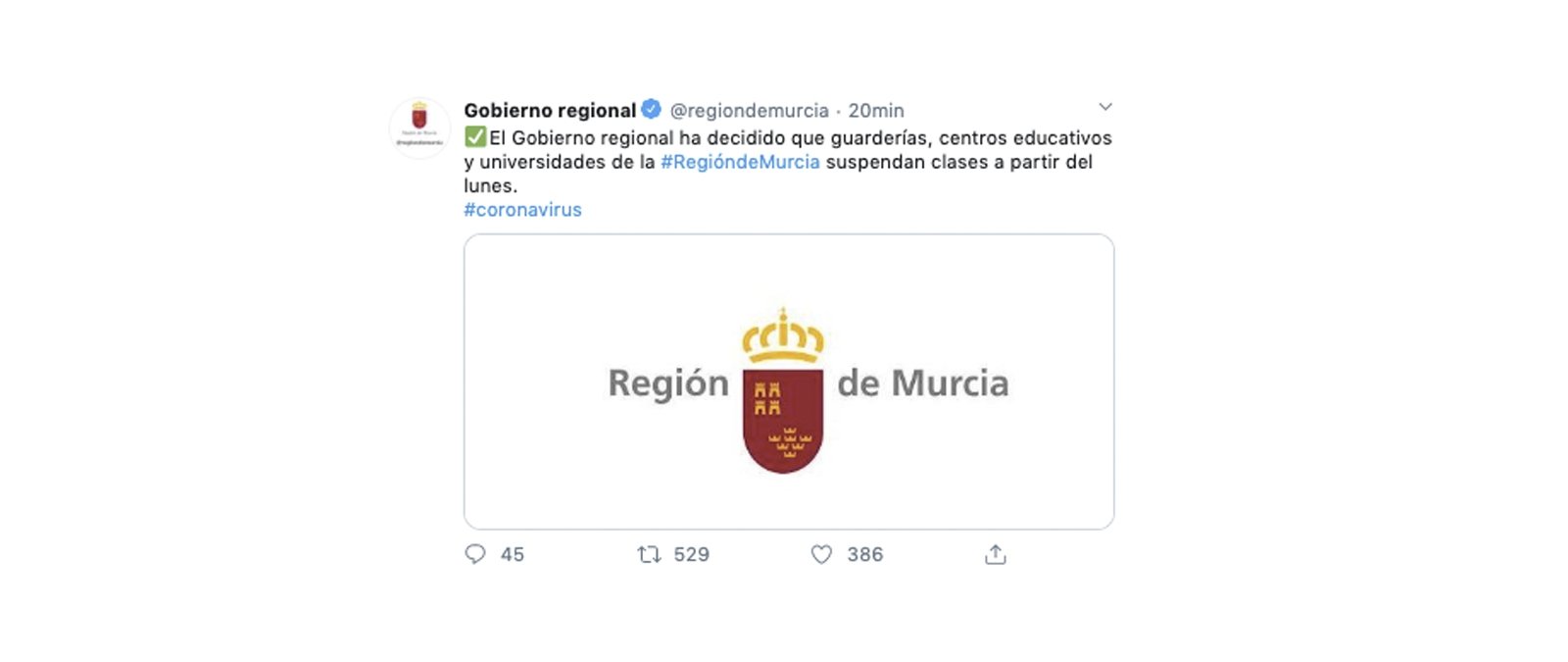El Gobierno regional de Murcia ha anunciado el 12 de marzo en un tuit a las 13:07 horas que a partir del lunes 16 de marzo se suspenderán clases en guarderías, centros educativos y universidades debido a la epidemia de coronavirus. Pero antes de eso había circulado un comunicado falso avisando del cierre a partir del viernes 13.