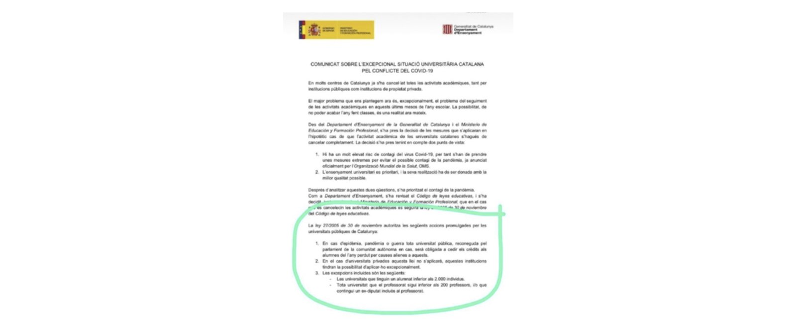 «Departamento de Educación de la Generalitat de Catalunya dice que se van a convalidar los créditos a los universitarios en Cataluña por la suspensión de las clases por el coronavirus»