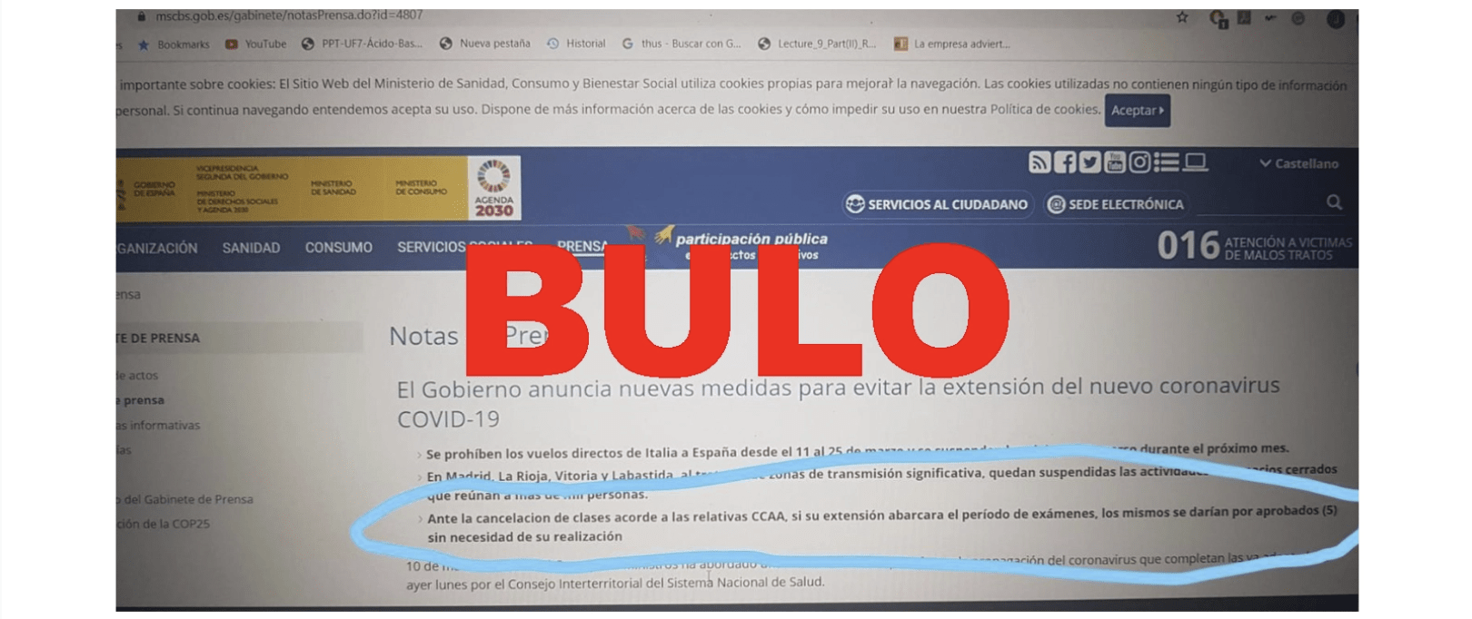 La URL que aparece en la captura es la de una nota de prensa real del Ministerio de Sanidad publicada el 10 de marzo. Al acceder a dicha dirección se puede comprobar cómo esa nota de prensa es idéntica a la de la captura salvo un apartado: el que dice que si la suspensión de las clases "abarcara el periodo de exámenes, los mismos se darían por aprobados (5)". Esa frase no está en ningún punto del comunicado oficial.