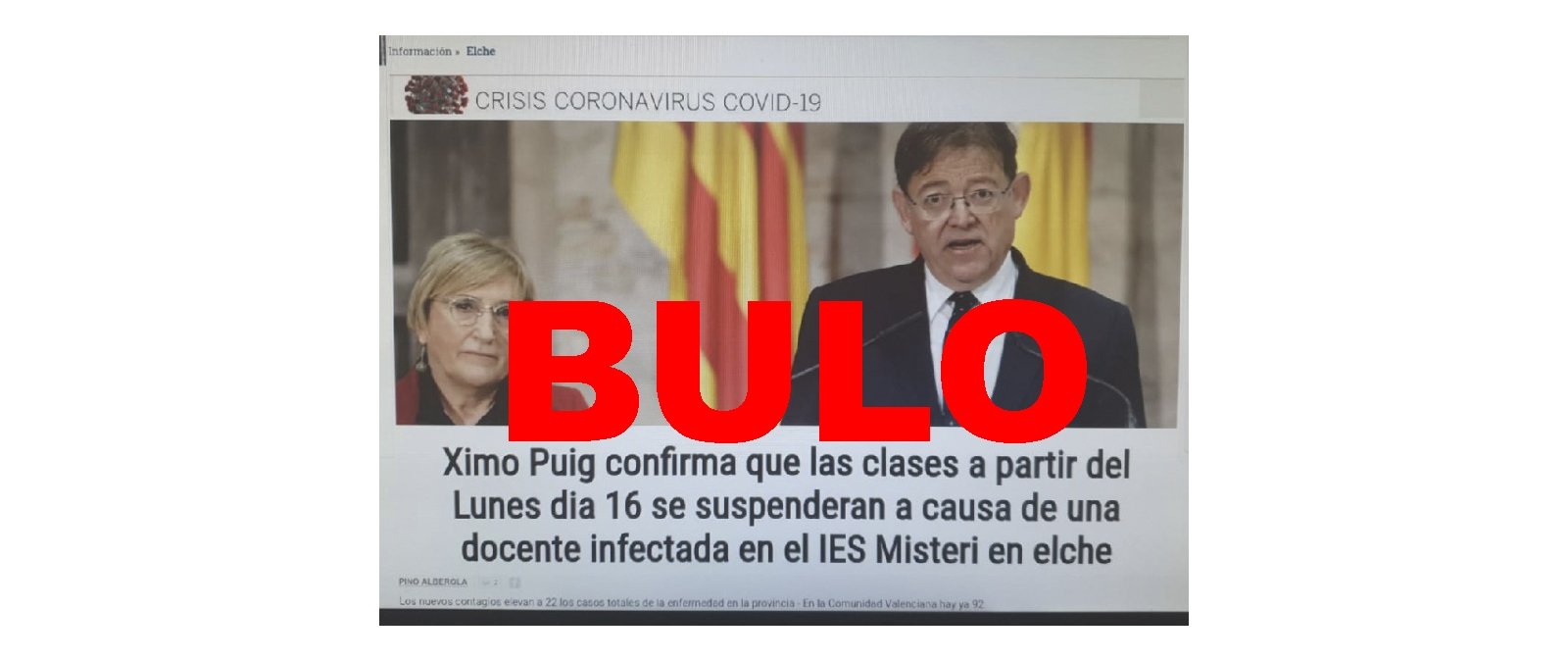 Está circulando una captura de un supuesto contenido del diario Información titulado "Ximo Puig confirma que las clases a partir del Lunes día 16 se suspenderan a causa de una docente infectada en el IES Misteri de elche (sic.)". Aunque las clases sí se han suspendido en la Comunidad Valenciana a partir del 16 de marzo, no ha sido por ese motivo. De hecho, no es una noticia real de dicho medio, sino un montaje.