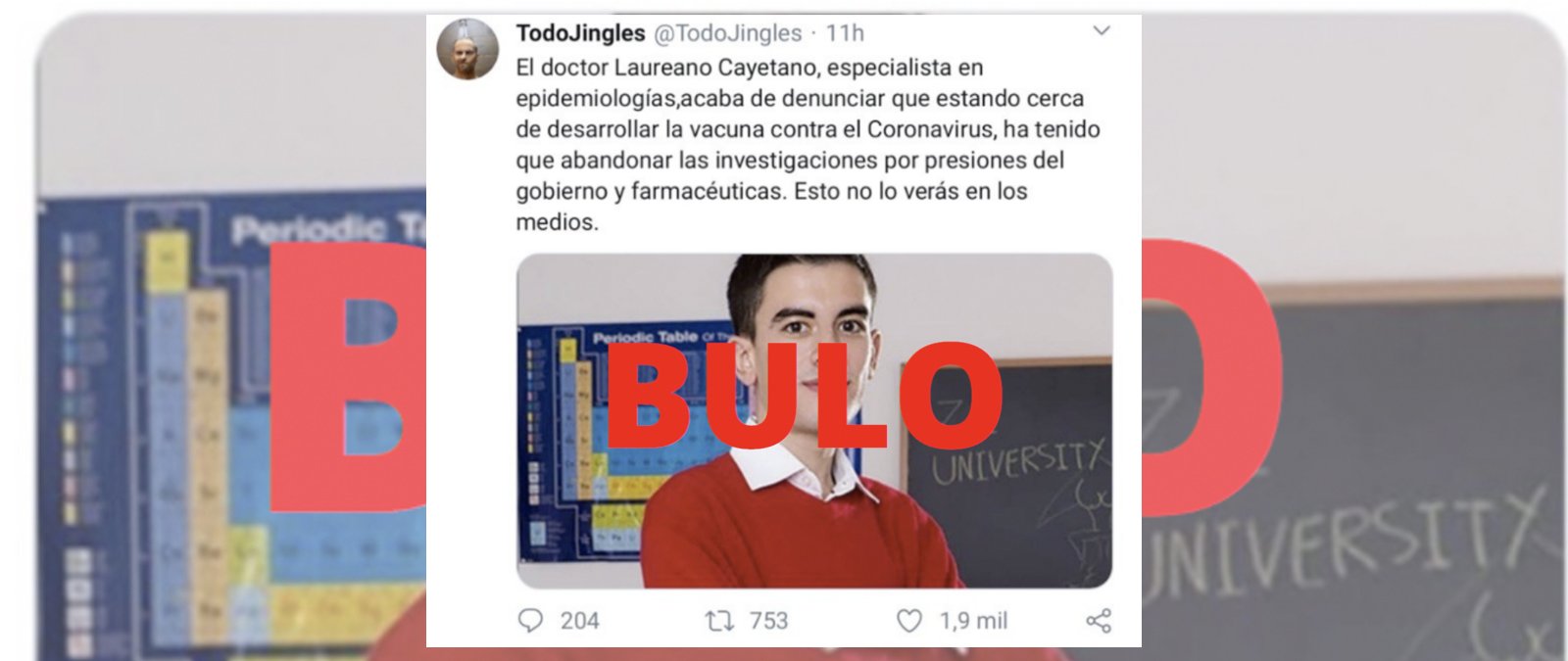 Una forma habitual de desinformar es difundir imágenes de famosos afirmando que se tratan de supuestos doctores o científicos que han creado algo novedoso. Ahora nos habéis hecho llegar una imagen de un chico afirmando que se trata del doctor Laureano Cayetano y que ha tenido que "abandonar las investigaciones" para desarrollar la vacuna contra el coronavirus "por presiones del Gobierno y farmaceúticas". Es un bulo: la persona de la fotografía no es doctor, es el actor porno Jordi el 'niño polla', y no ha desarrollado la vacuna contra este virus.