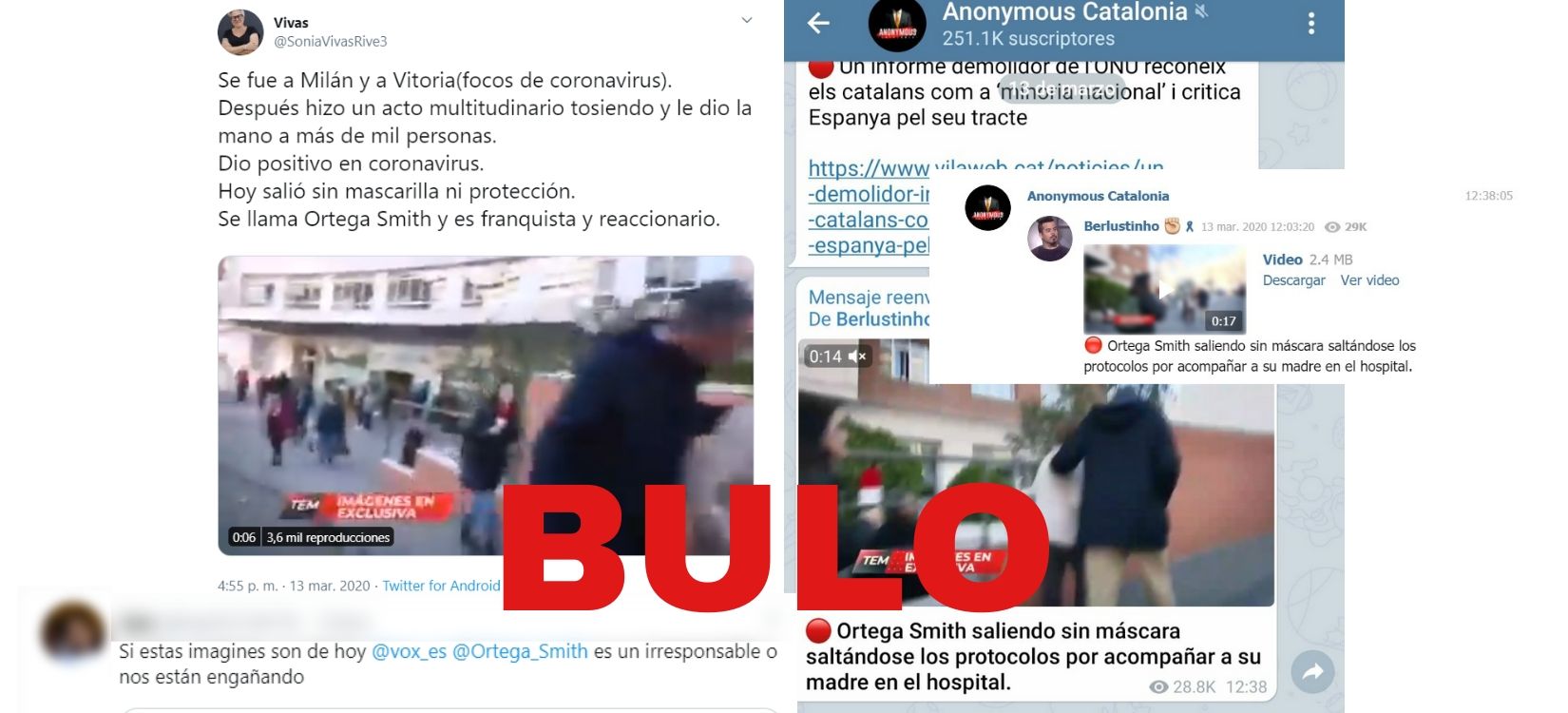El vídeo que se está viralizando de Ortega Smith en la calle junto a su madre después de salir del hospital no es de hoy, (viernes 13 de marzo) fue grabado el 9 de marzo, un día antes de que anunciase que tenía coronavirus. Se está viralizando como si hubiera sido grabado hoy. Los mensajes dicen: "dio positivo en coronavirus. Hoy salió sin mascarilla ni protección". Además, el grupo de difusión de Telegram de Anonymous Catalonia también lo ha movido en sus redes. Cuidado con ellas porque estas imágenes no han sido grabadas hoy.
