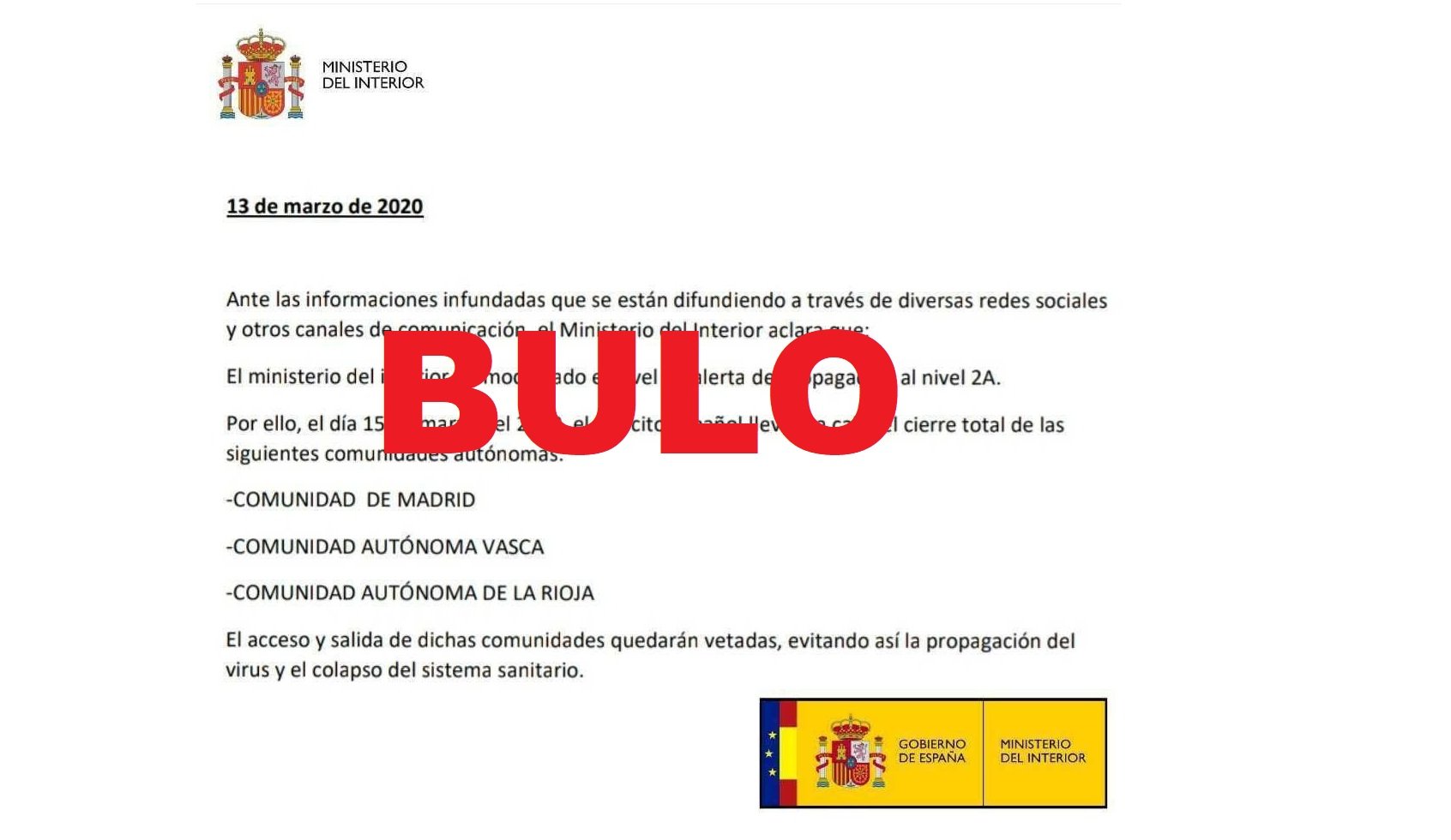 El propio ministerio nos lo confirma: "El ministerio del Interior no ha emitido ningún comunicado ni nota en este sentido ni en ninguno similar, y no se ha adoptado ningún tipo de medida como la que se refleja en este montaje Cualquier comunicado o nota del Ministerio del Interior aparece en la página www.interior.gob.es Si no está ahí, es un BULO".