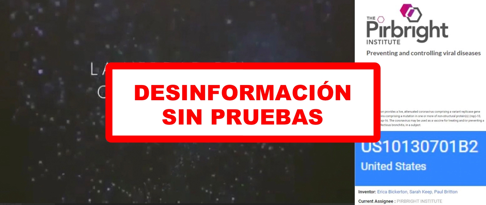 El vídeo se basa en una patente que hizo el Pirbright Institute en 2014. Pero como ya os explicamos respecto a una cadena de WhatsApp que afirma que Bill Gates es el propietario de la patente del coronavirus, en realidad esta patente no corresponde a esta nueva cepa de coronavirus descubierta en diciembre de 2019 sino que la patente cubre "el desarrollo de una forma atenuada del coronavirus que potencialmente podría usarse para prevenir enfermedades respiratorias en aves y otros animales", han explicado desde esta institución a Maldita.es. El Instituto Pirbright también niega trabajar con coronavirus humanos.