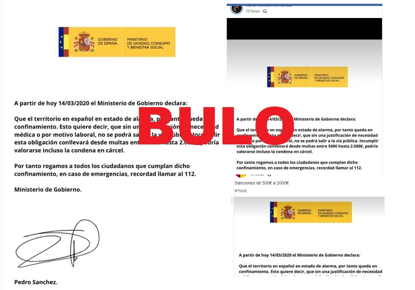 El falso el supuesto comunicado firmado por Pedro Sánchez ordenando el confinamiento de la población que se está viralizando. En este montaje se dice que sin "una justificación médica o por motivo laboral no se podrá salir a la vía pública" todo bajo multas de entre 500€ hasta 2000€ y se valorará "incluso la condena en cárcel". Es un montaje. Tiene sello del "Ministerio de Sanidad, Consumo y Bienestar Social" que no existe actualmente. También usa la denominación de "Ministerio de Gobierno" que tampoco es real.